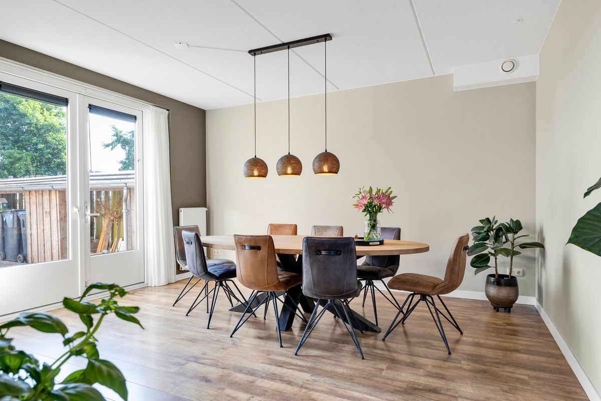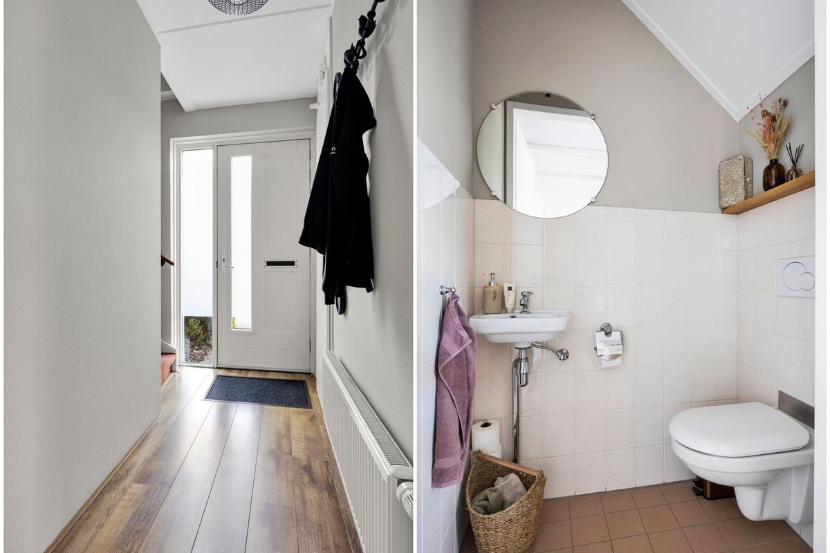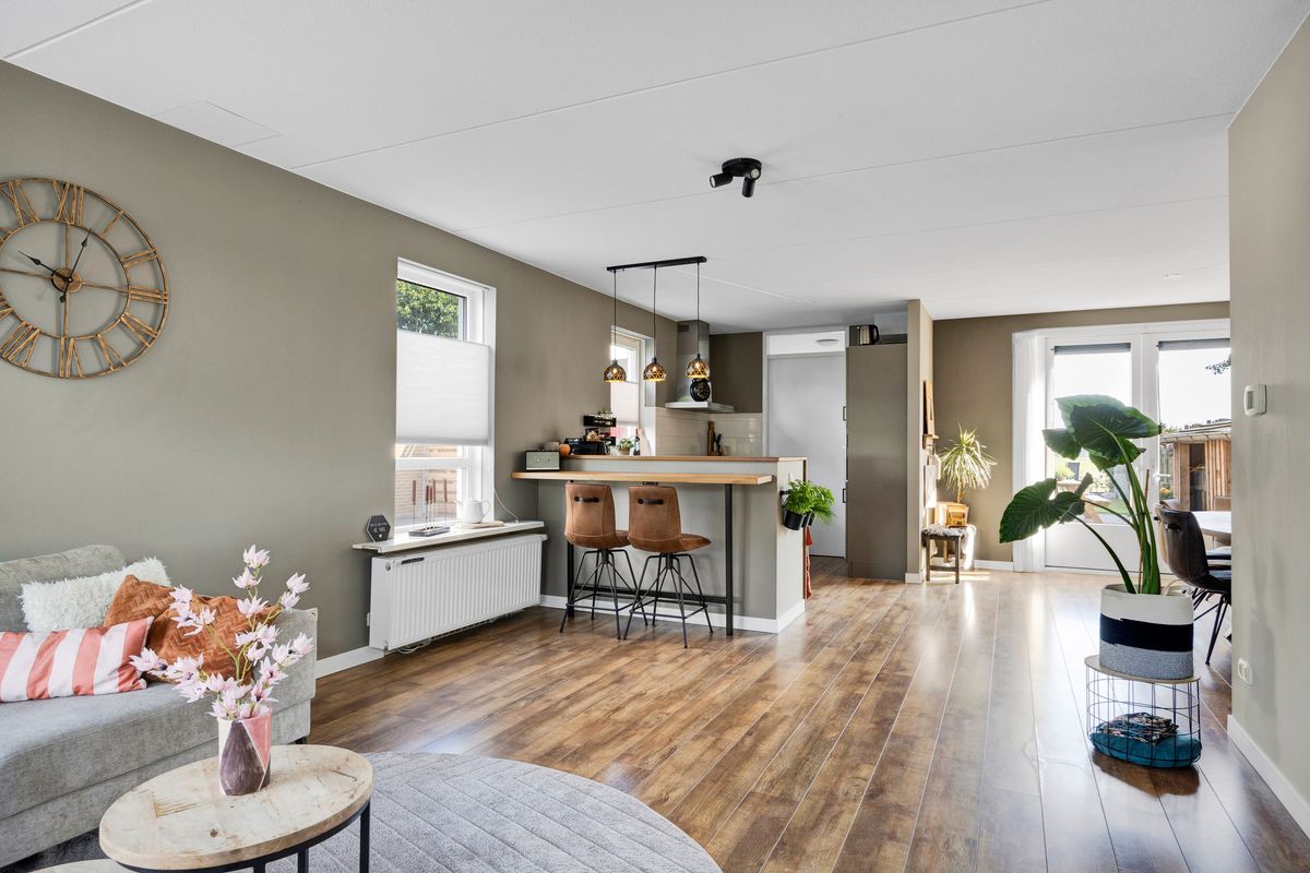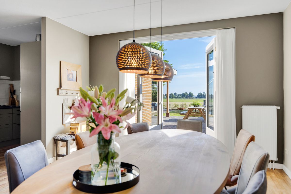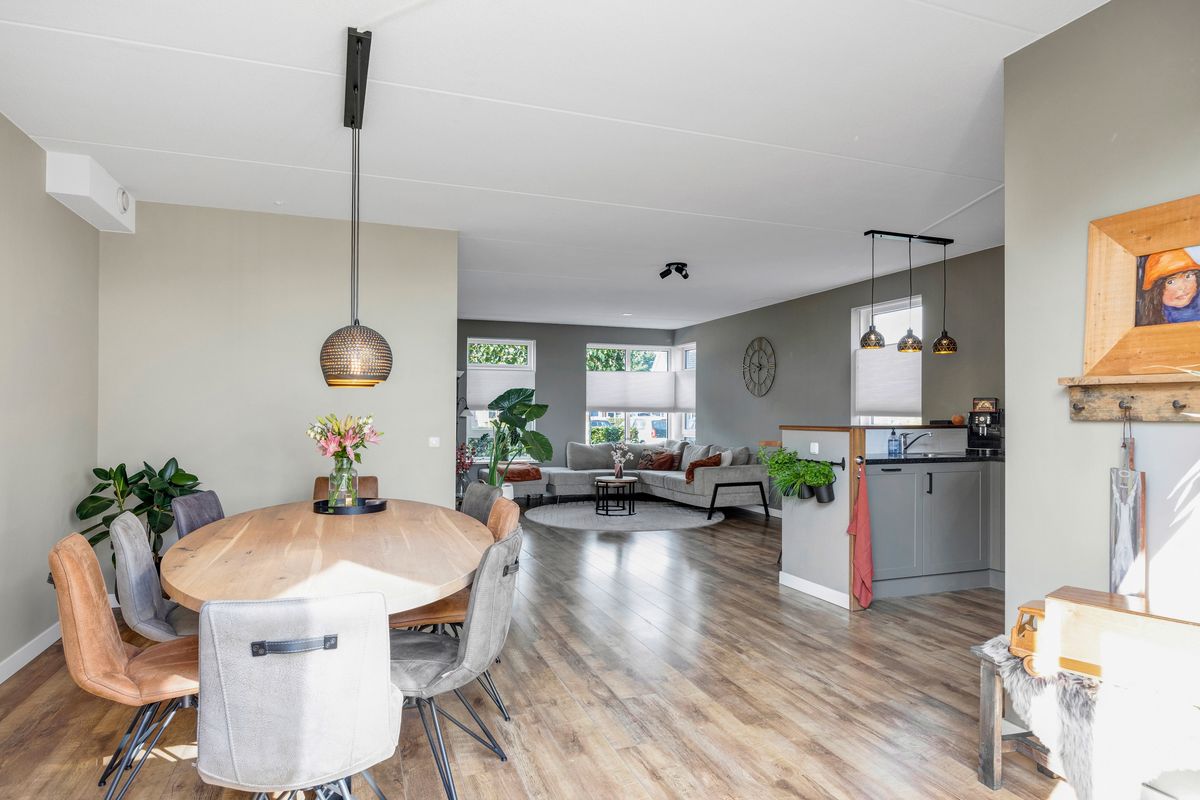 Nadat we de auto op eigen erf geparkeerd hebben betreden we de woning via de voordeur, we komen in de hal met trapopgang, meterkast, toilet en ruime inbouwkast, links van de hal bevindt zich de Z-vormige woonkamer, deze is ruim en licht en heeft openslaande deuren naar de achtertuin, al zittend aan de eetkamertafel geniet je van het uitzicht, heerlijk toch.
