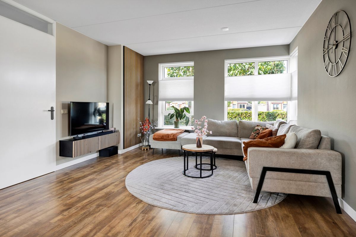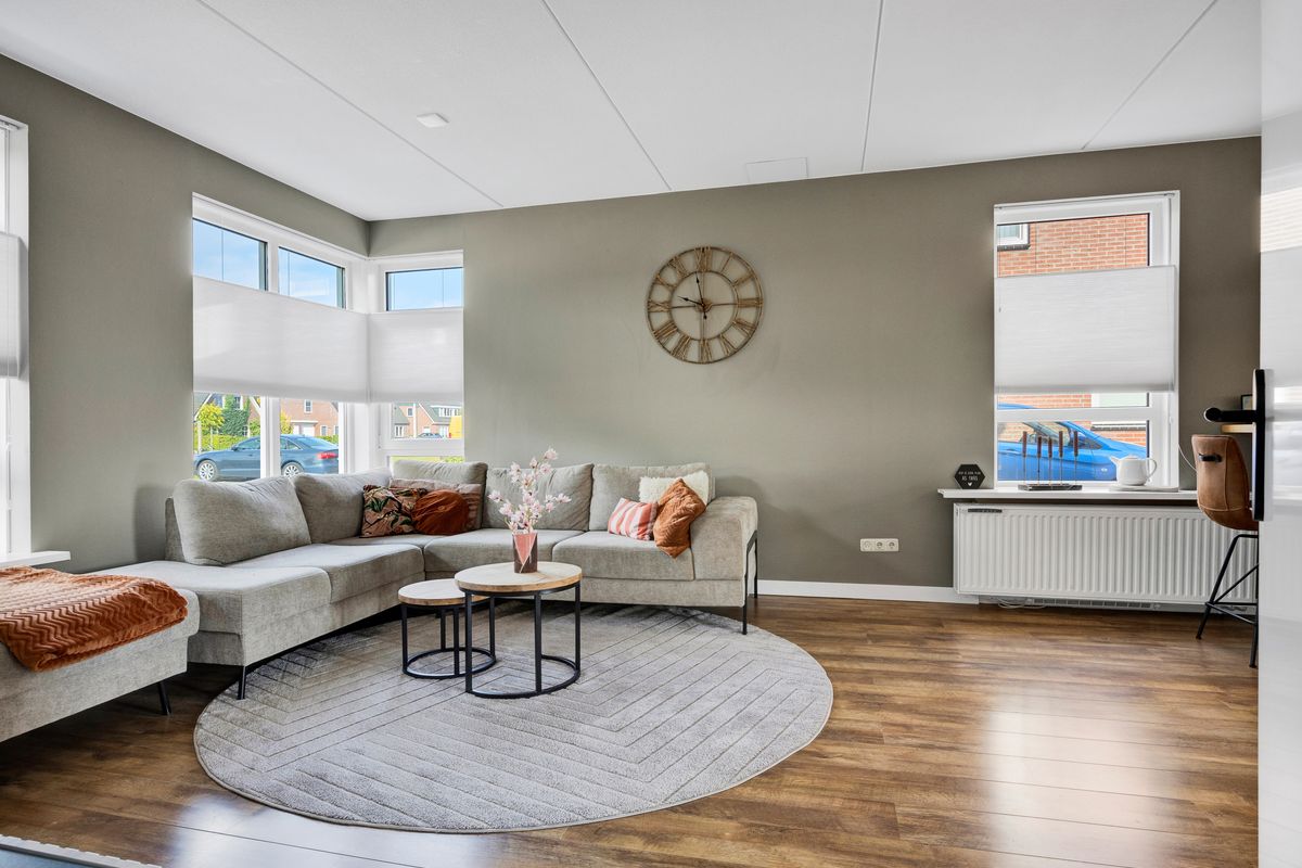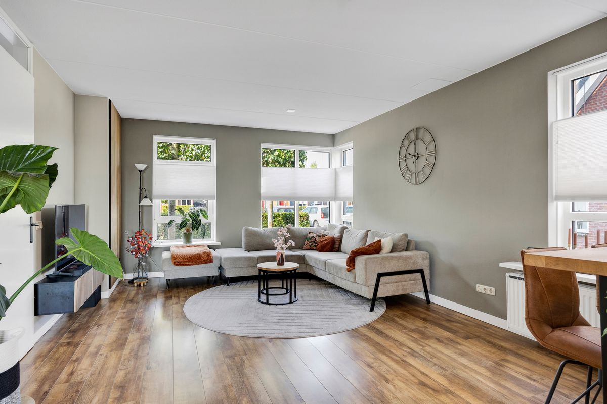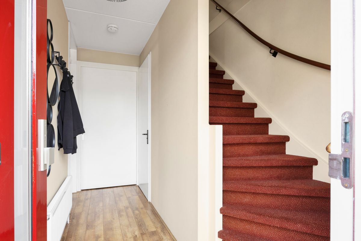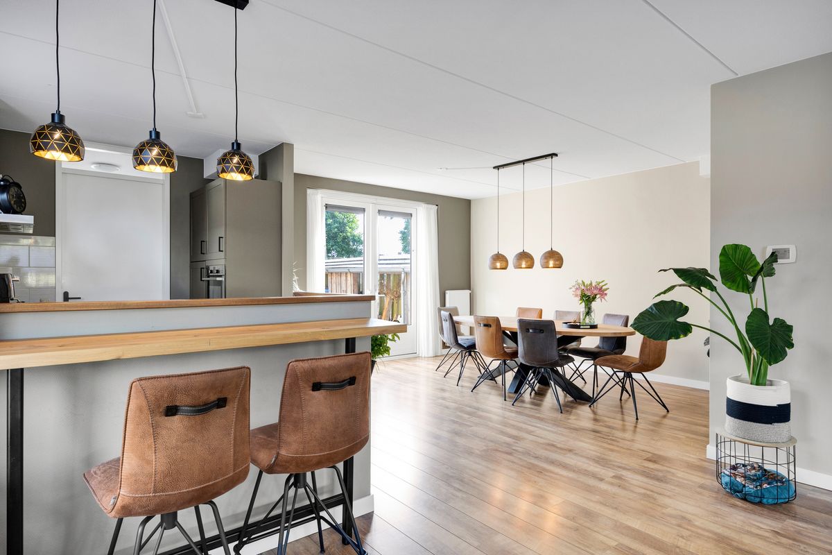 Nadat we de auto op eigen erf geparkeerd hebben betreden we de woning via de voordeur, we komen in de hal met trapopgang, meterkast, toilet en ruime inbouwkast, links van de hal bevindt zich de Z-vormige woonkamer, deze is ruim en licht en heeft openslaande deuren naar de achtertuin, al zittend aan de eetkamertafel geniet je van het uitzicht, heerlijk toch.