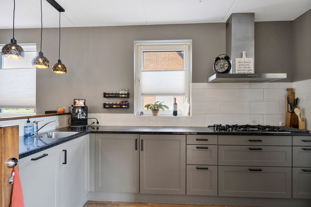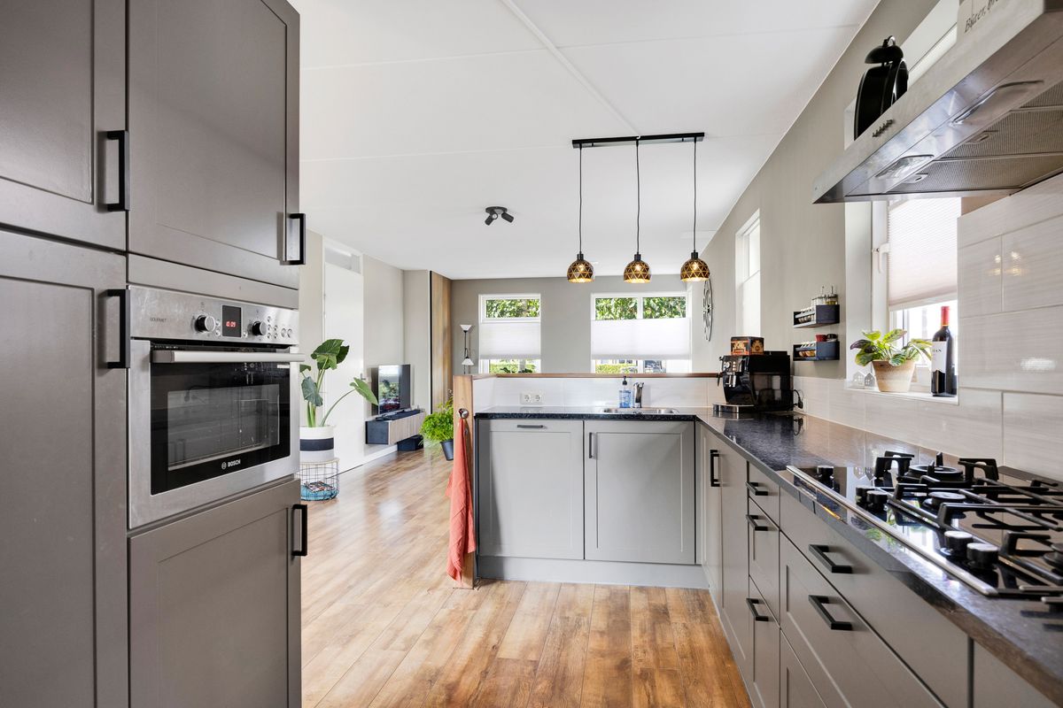 De open keuken is modern en uitgevoerd in een hoekopstelling met granieten aanrechtblad en welke voorzien is van diverse inbouwapparatuur zoals; 5-pits gaskookplaat, afzuigkap, vaatwasser, close-in-boiler en oven. Achter de keuken bevindt zich de bijkeuken met aansluiting voor de wasmachine en droger, tevens loopdeur naar de aangebouwde garage en deur naar de oprit, de zogenaamde achterdeur, en een deur naar de achtertuin. De gehele begane grond is voorzien van vloerverwarming. De garage is ca. 6,60x3,10 m. en heeft openslaande deuren naar het terras met overkapping en de riante achtertuin met weids uitzicht over de landerijen en diverse terrassen om van dit uitzicht te genieten.