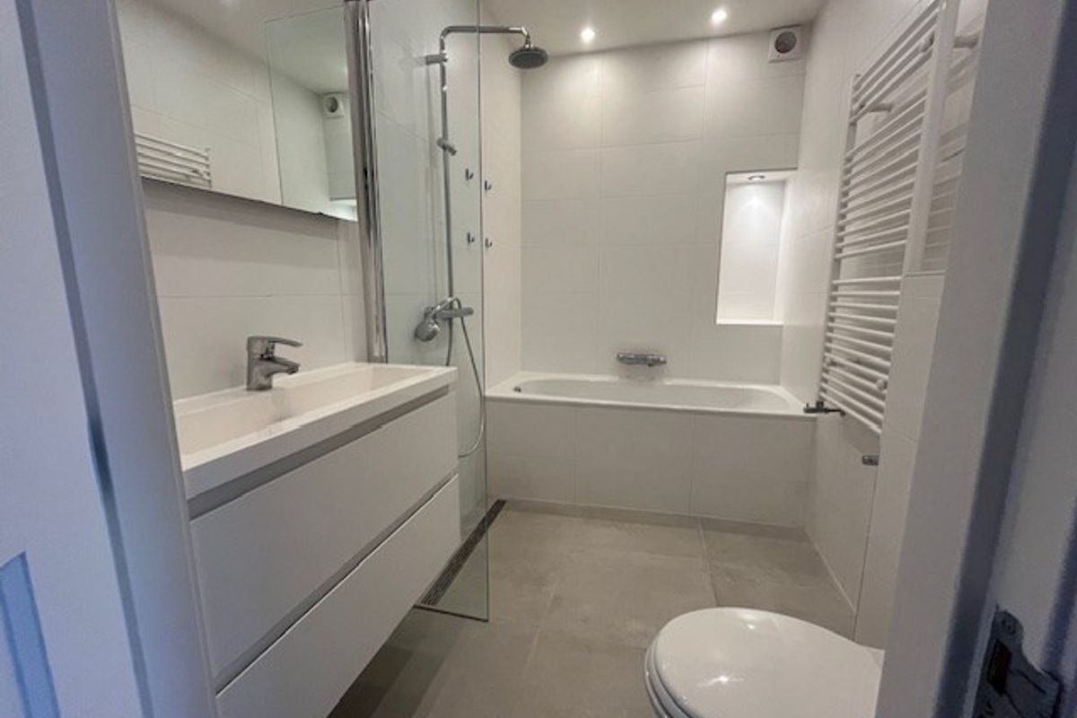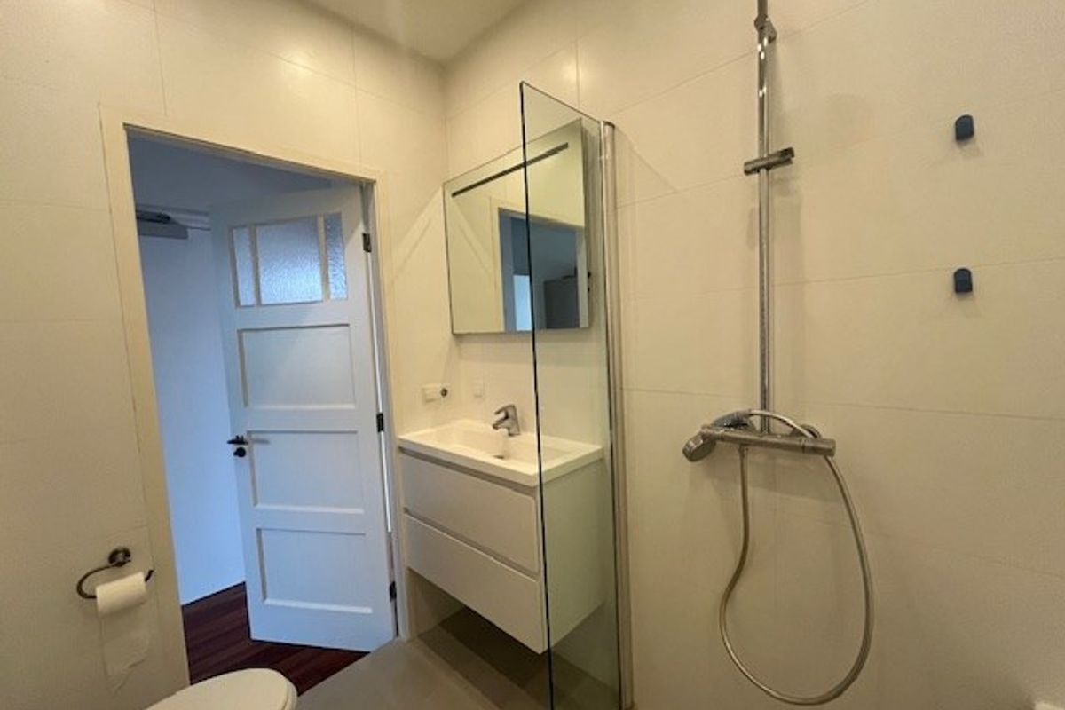 De badkamer heeft een aparte, douche, bad, wastafel en toilet.
