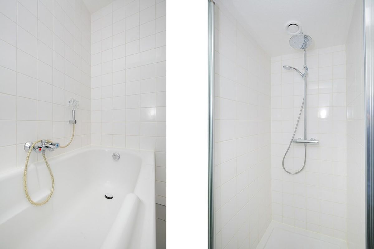 De luxe badkamer beschikt heeft een wastafel, bad en aparte douche.