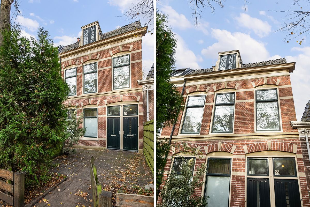 De woning heeft een klassieke gevel met fraai gemetselde bogen boven de hoge ramen, en binnen vallen direct de rijke lichtinval en het gevoel van ruimte op.