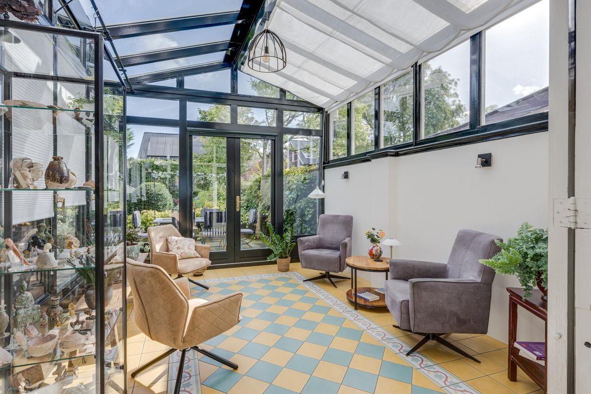 voortuin met oprit, voordeur, entree woning, vestibule met meterkast, deur naar de hal met trap naar bovengelegen verdieping, toilet en deur naar de voorkamer. kamer en suite met deur doorgang naar de prachtige aangebouwde (volledig geïsoleerde) serre. deuren naar de prachtige achtertuin. In de achtertuin bevindt zich de garage / berging.