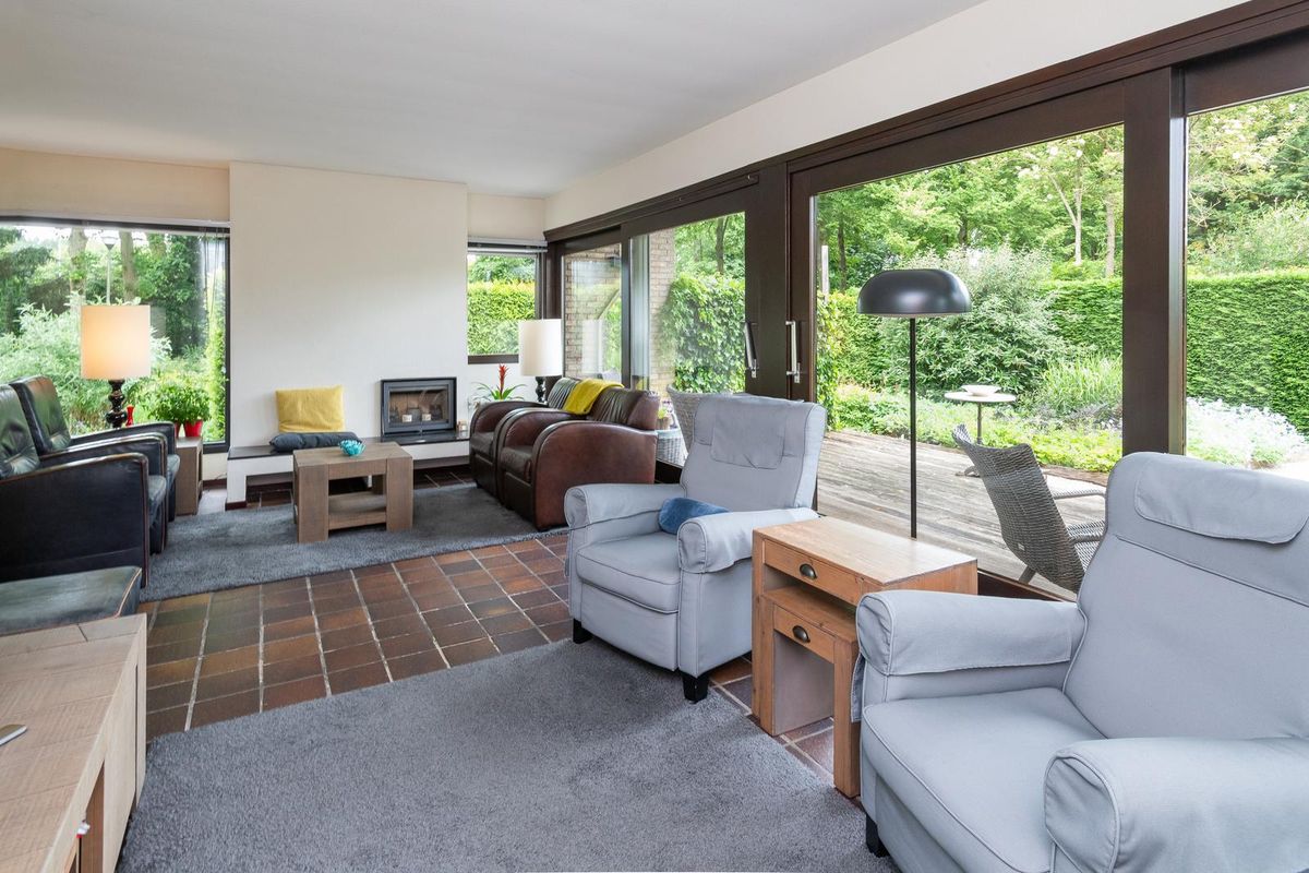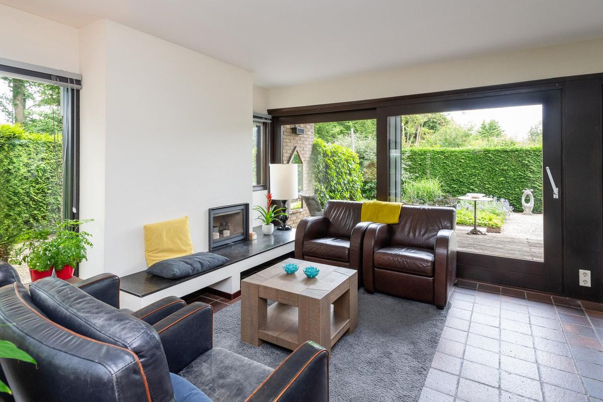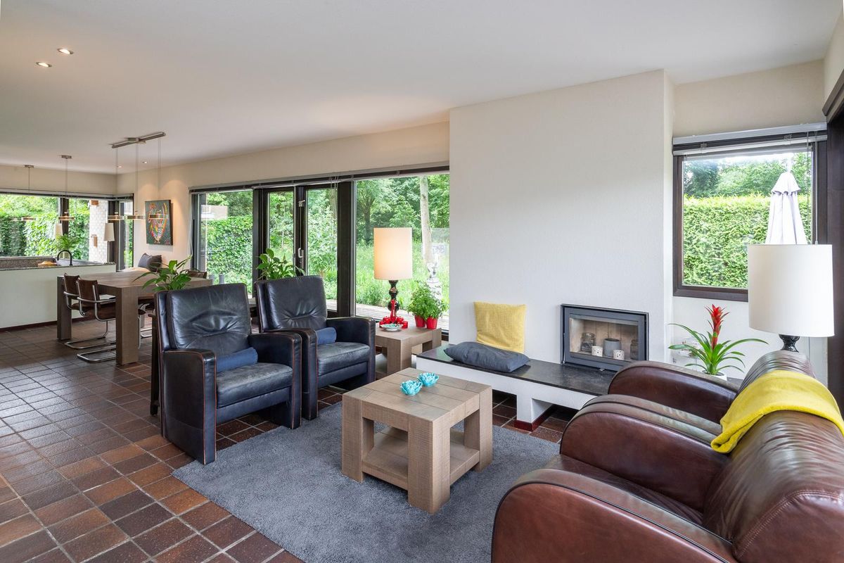 De riante living voelt heel sfeervol aan en beschikt over grote raampartijen die zorgen voor een mooi uitzicht op de tuin rondom en bieden een overvloed aan daglicht, sfeervolle open haard, openslaande deuren naar de zijtuin en een schuifpui naar de achtertuin. De living staat in open verbinding met de iets lager gelegen keuken (split-level), welke is voorzien van inbouwapparatuur waaronder een keramische kookplaat, afzuigkap, vaatwasser, dubbele spoelbak met zwarte Quooker-kraan en een granieten werkblad met een doorlopende achterwand.
