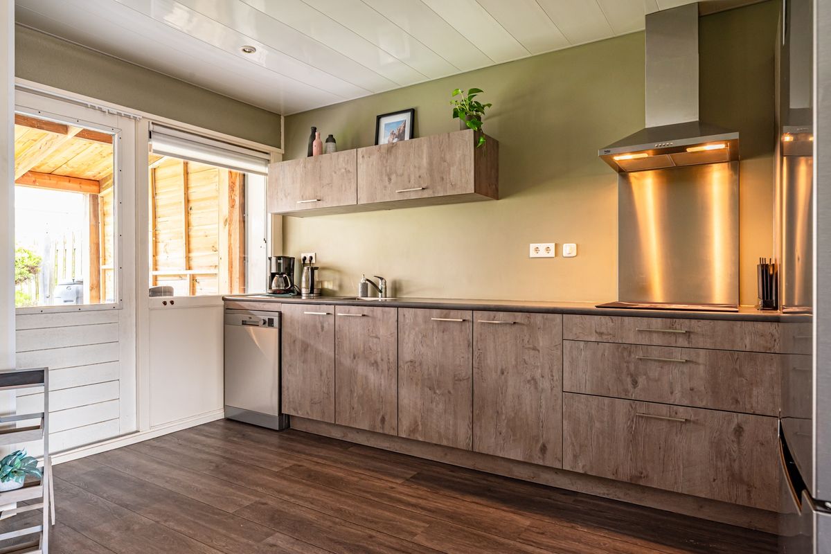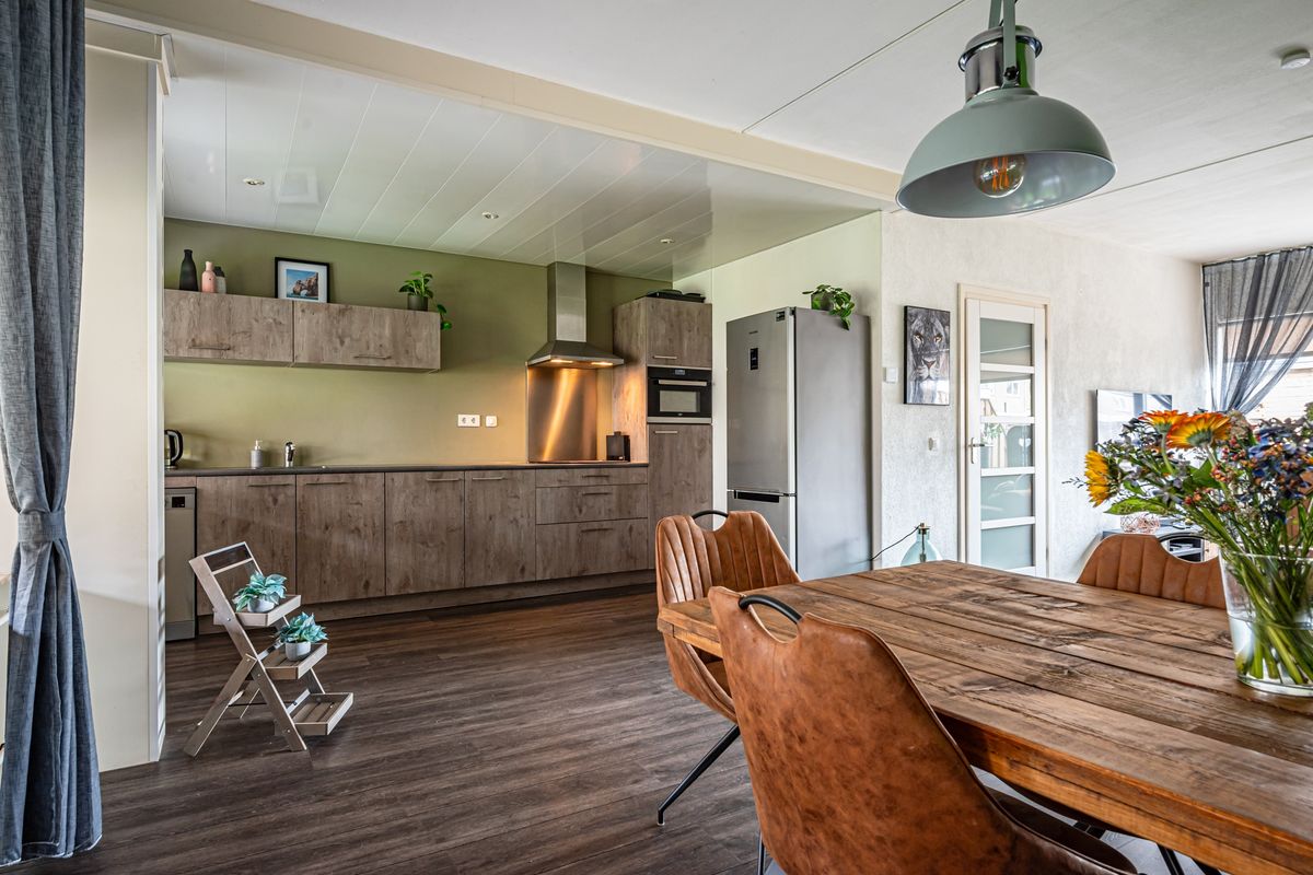 Ruime woonkamer met half open keuken. Volledig voorzien van mooie pvc vloer. De keuken is voorzien van spoelbak, inductiekookplaat, rvs afzuigkap, koelkast, combimagnetron en een losse vaatwasser.