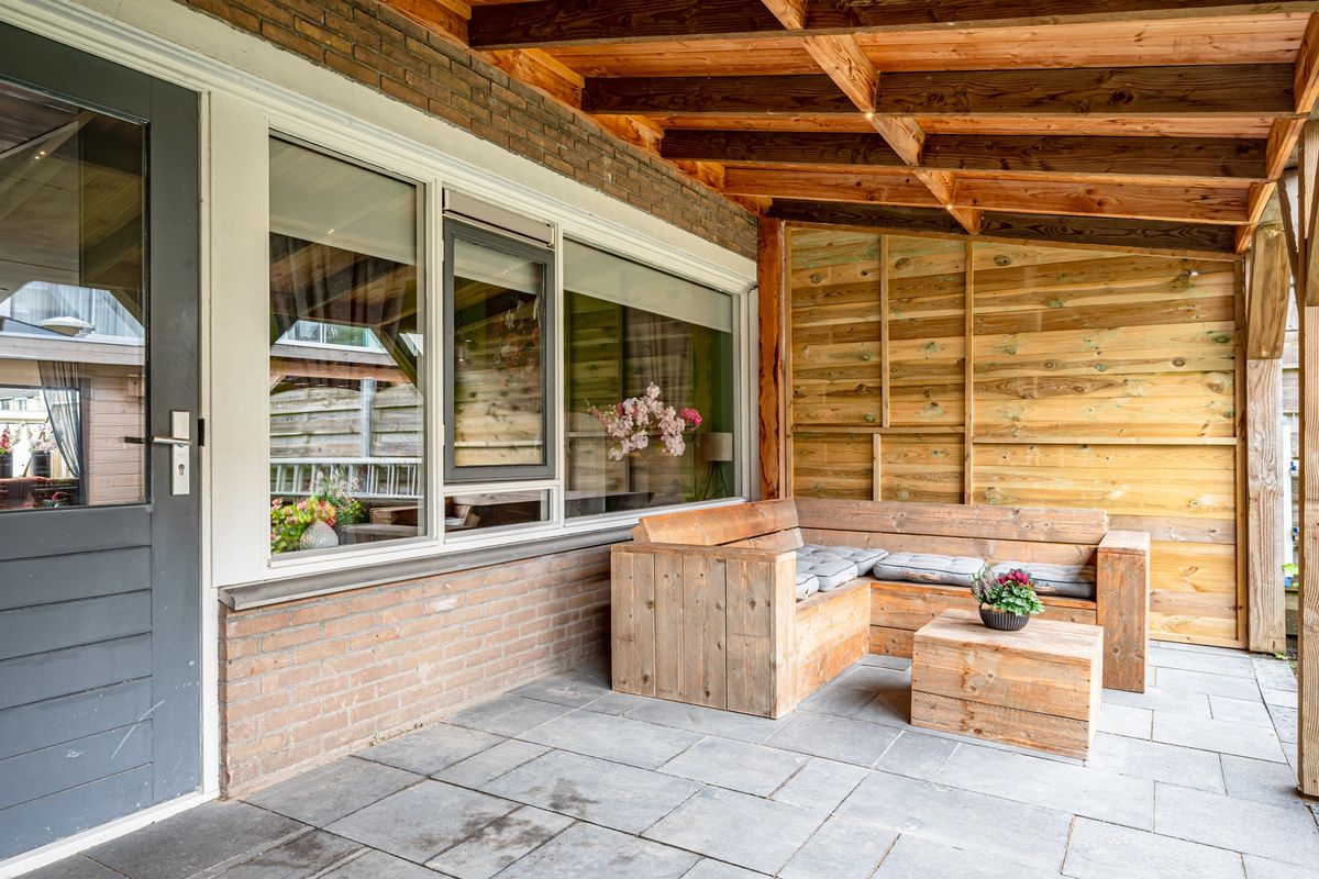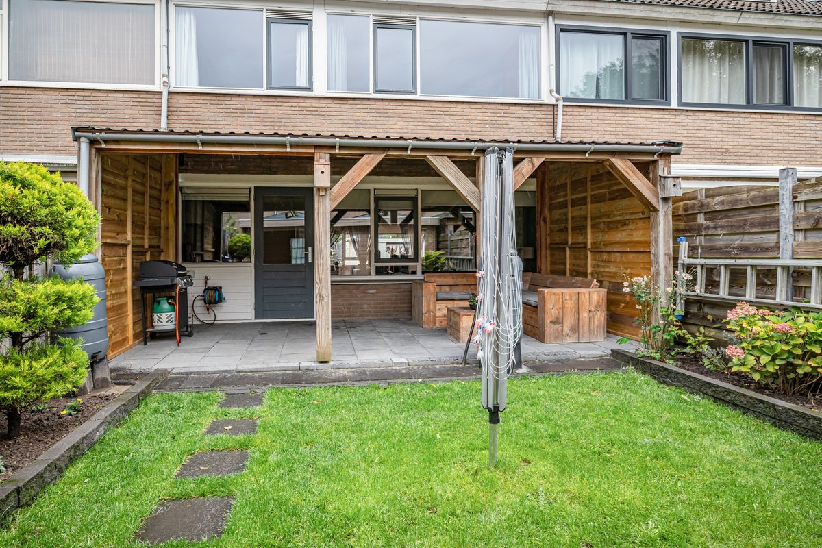 Fraai aangelegde voortuin met een eigen oprit voor de auto een praktische stenen fietsenberging. De achtertuin met terras, gazon en beplanting. Vrijstaande houten berging met elektra en een overkapping. Aan de achtergevel is ook een houten overkapping aanwezig met verlichting en er is een buitenkraan.