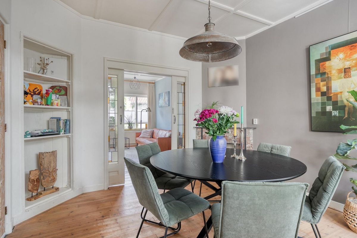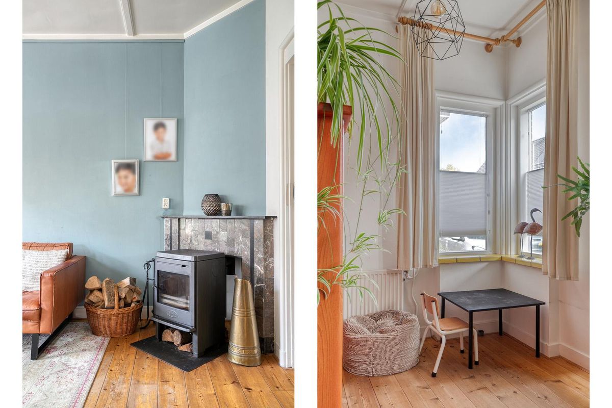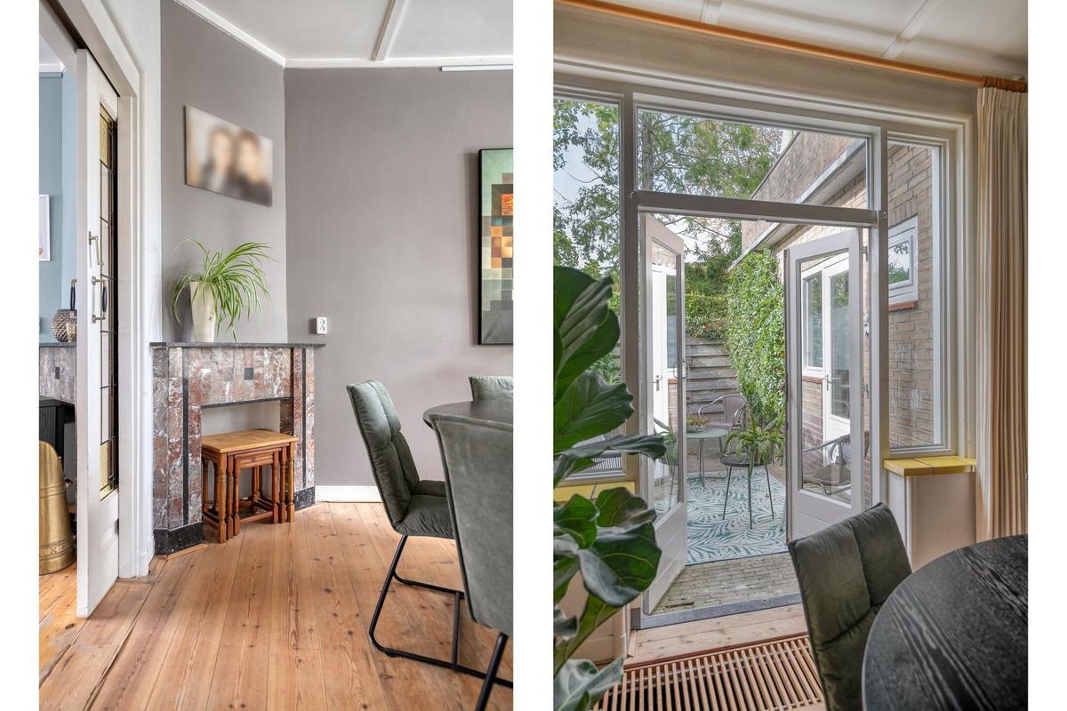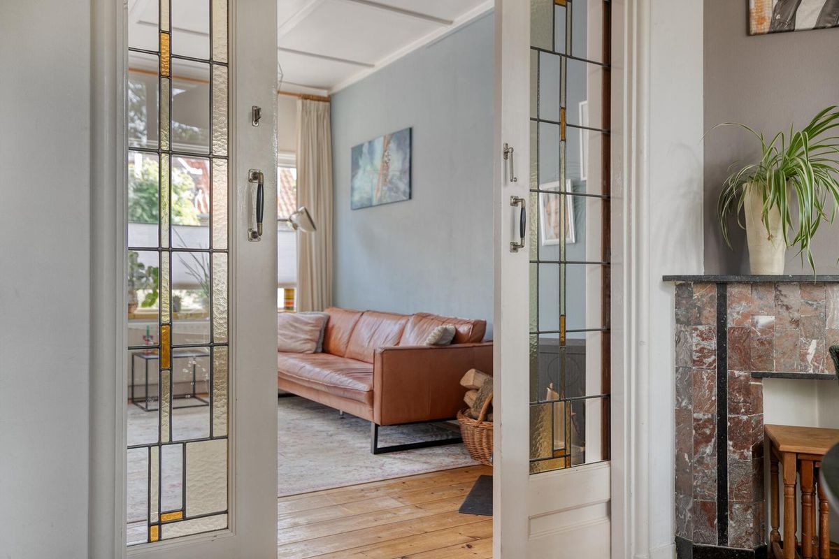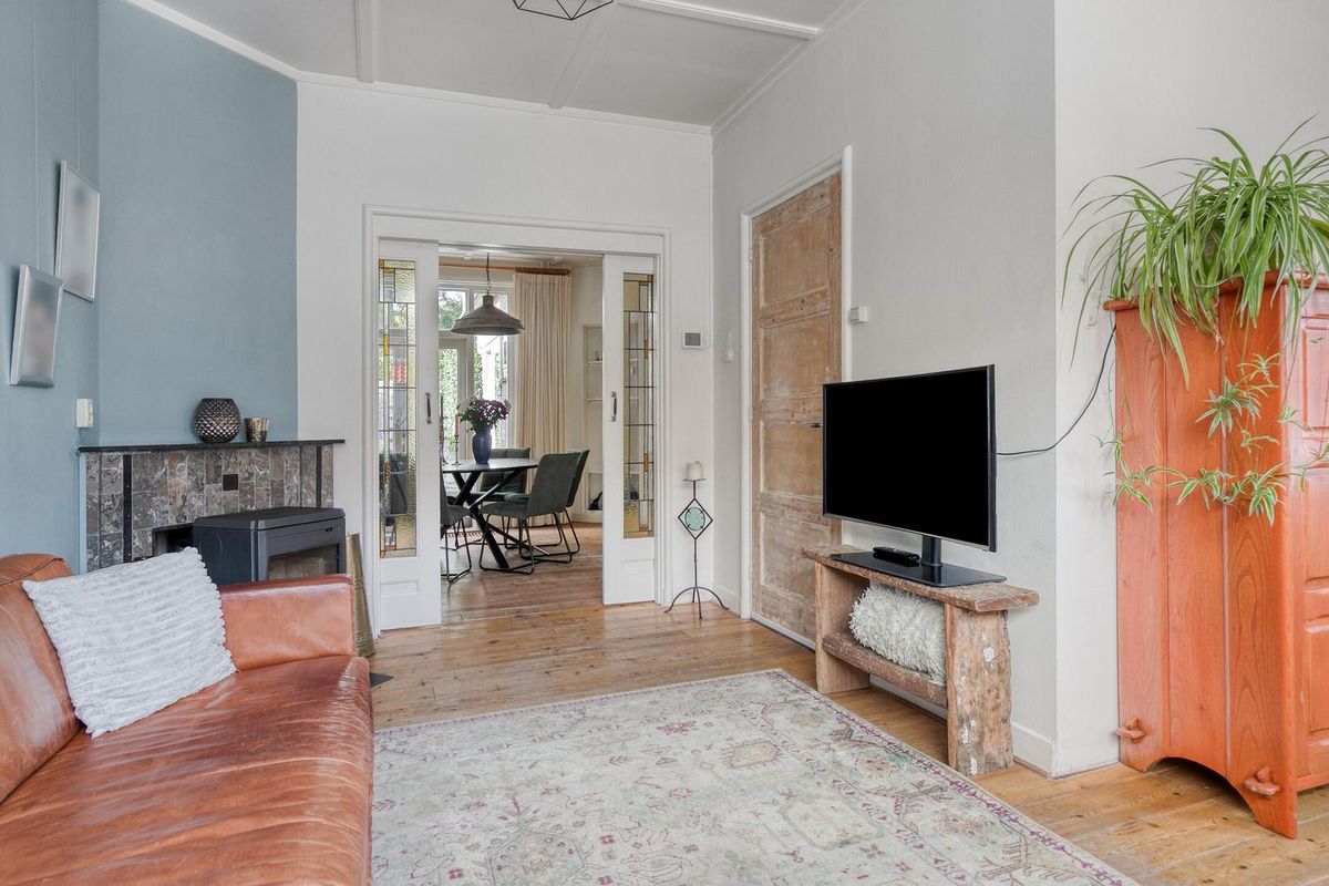 De woonkamer is zoals in een jaren dertig woning betaamd in en-suite opstelling vormgegeven. De originele schuifdeuren tussen de voor- en achterkamer zijn nog aanwezig waarmee de woonkamer de sfeer biedt die u van een dergelijke woning mag verwachten. Het algehele uitrustings- en afwerkingsniveau in deze woning zijn smaakvol en kwalitatief uitgevoerd. Let vooral op de sfeervolle originele schouw, strakke wandafwerking en smaakvolle originele aspecten. De houtkachel welke in de voorkamer is te vinden biedt u gezelligheid en warmte.