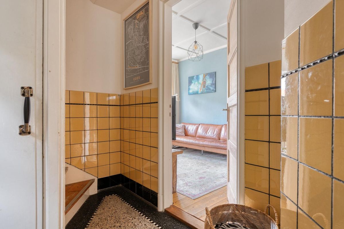 Via de voordeur aan de zijkant van de woning kan de woning betreden worden. Via de entree wordt de ruime en sfeervolle hal bereikt. De hal beschikt over een smaakvolle en originele granito vloer met de aanvullende originele en authentieke details. De hal biedt toegang tot alle vertrekken op de begane grond.