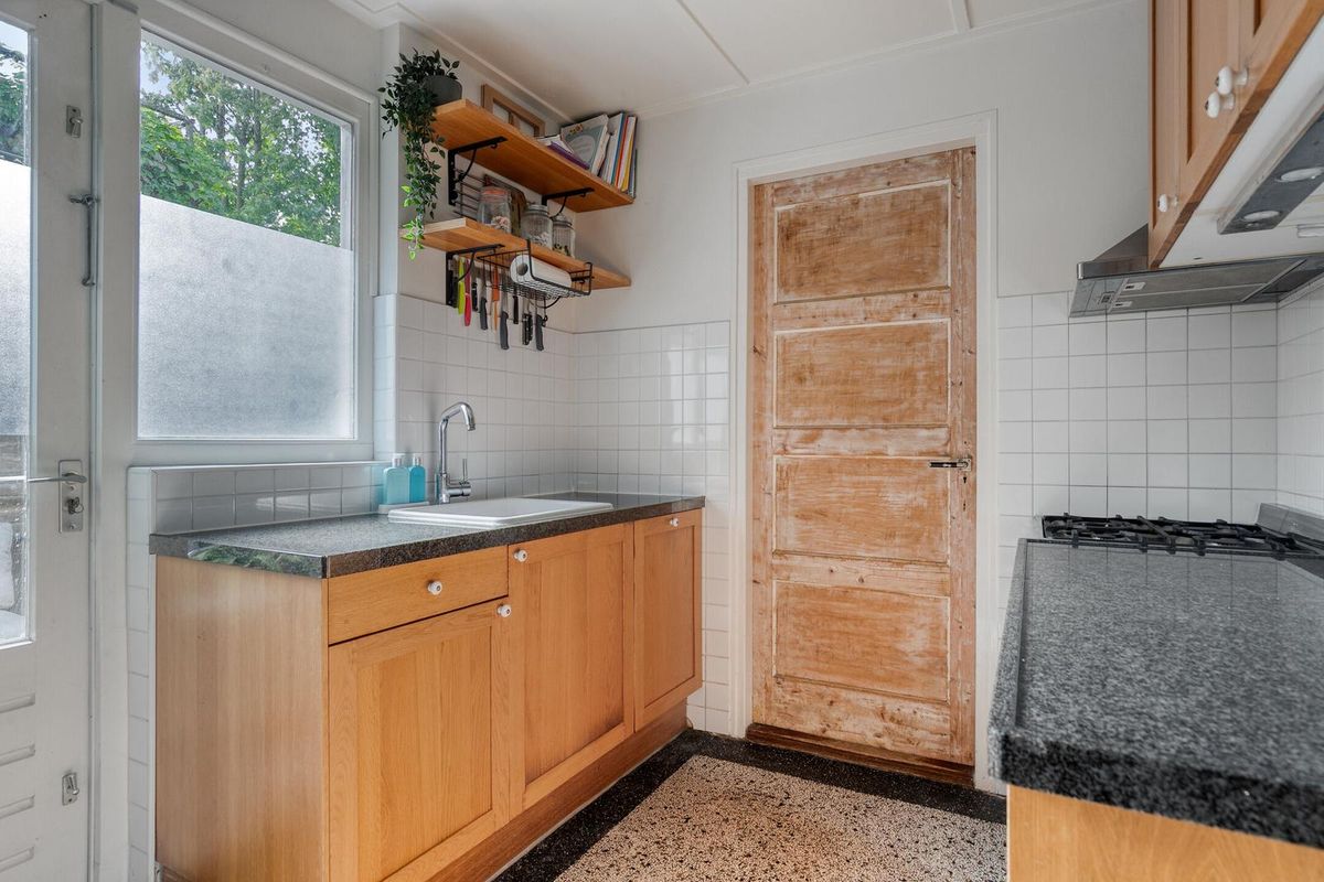 De woning is aan de achterzijde achter de hal uitgebouwd. Hier zijn voorts de keuken en de bijkeuken te vinden. De keuken betreft een keurige opstelling welke is voorzien van degelijke inbouwapparatuur. De bijkeuken welke achter de keuken is gelegen is de ideale plaats om proviand en tuinspullen op te bergen.