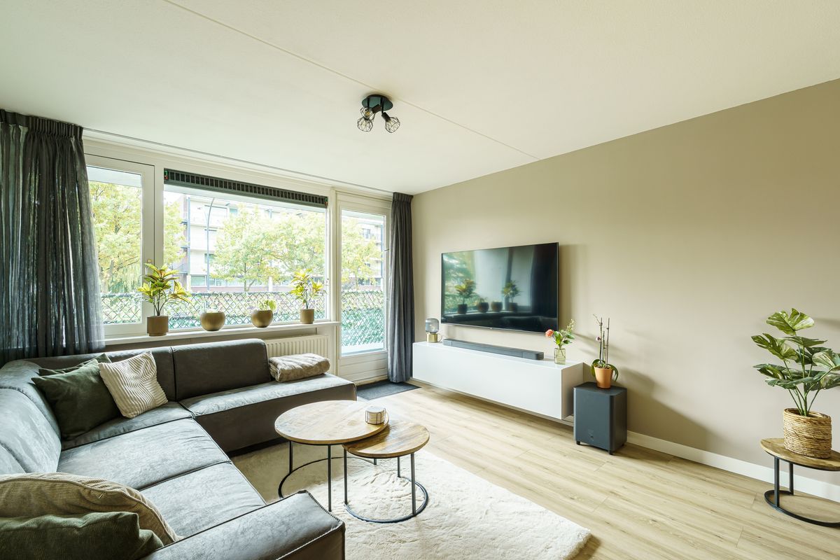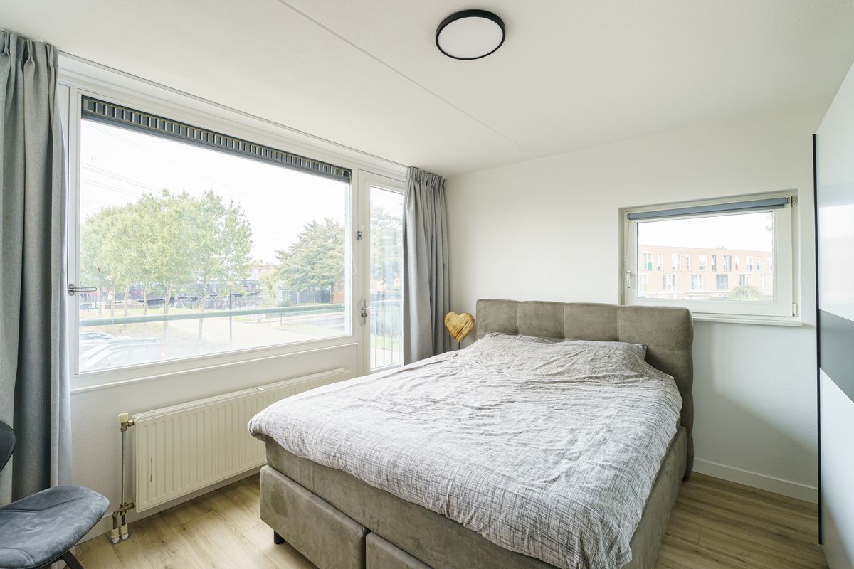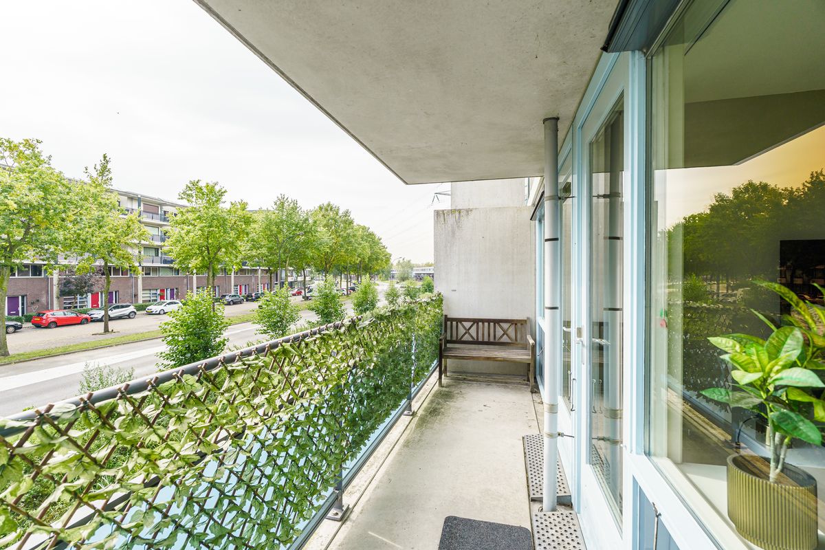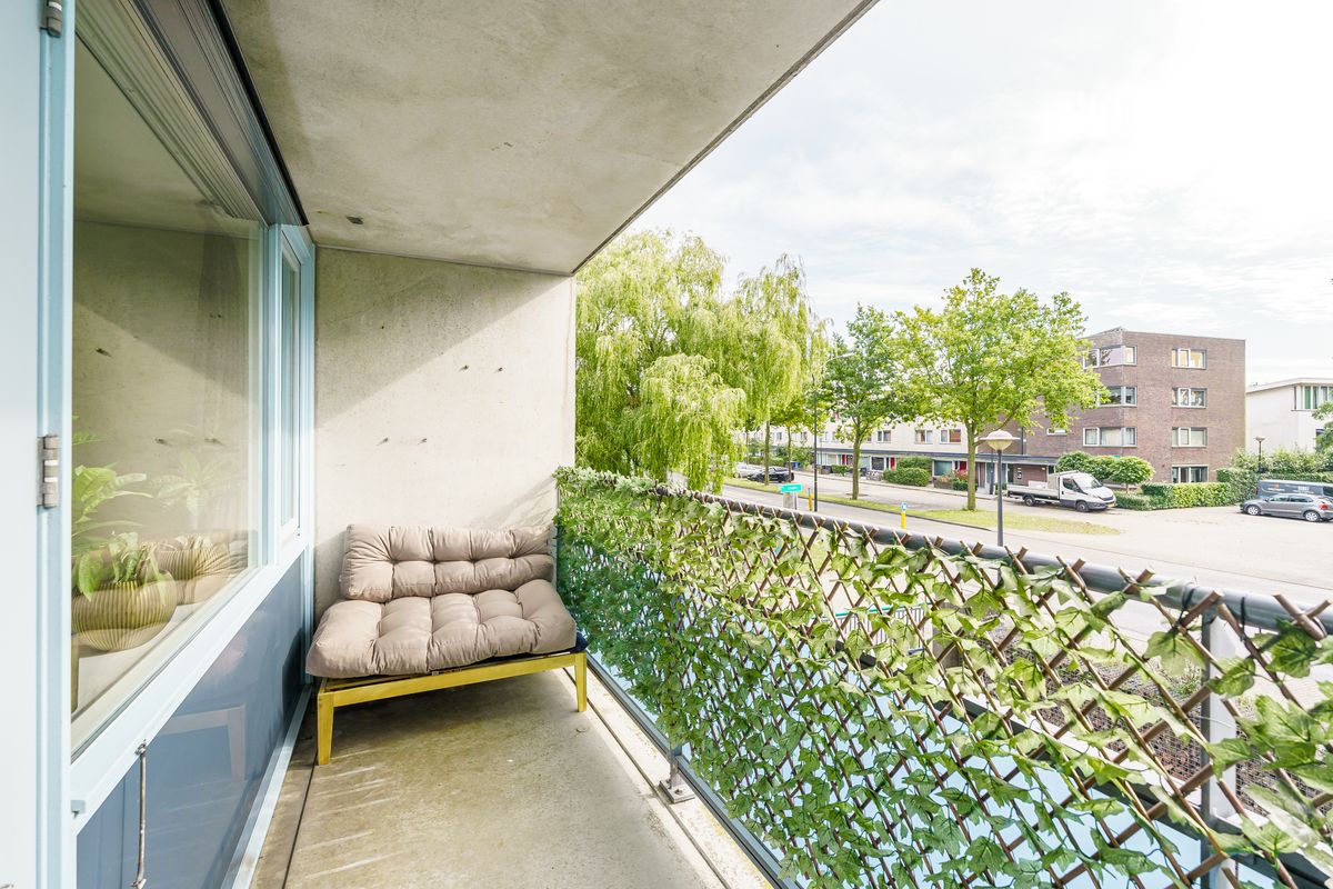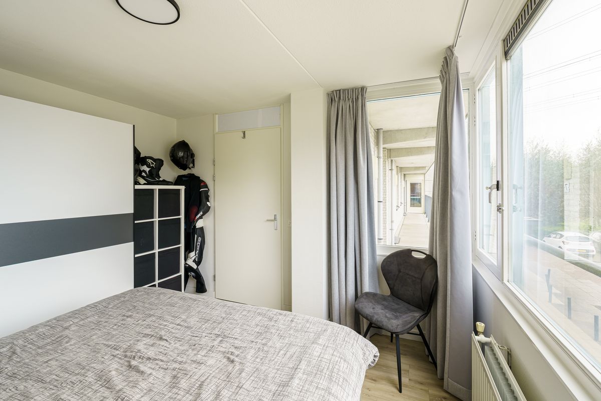 De woonkamer voelt extra ruim aan door het extra zijraam; een voordeel van de hoekligging van het appartement. Vanuit zowel de woonkamer als de achterste slaapkamer heb je toegang tot het woningbrede balkon. De tweede slaapkamer ligt aan de voorzijde van het appartement en is opvallend ruim, omdat de galerij ophoudt bij de voordeur en je daardoor extra ruimte hebt in de slaapkamer. De eerste verdieping is bereikbaar met de trap of met de lift.