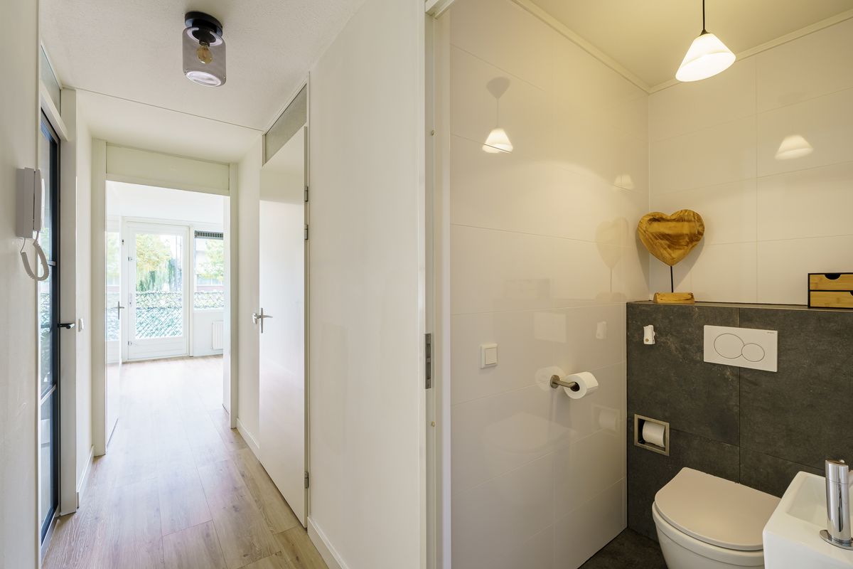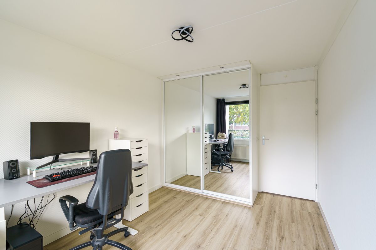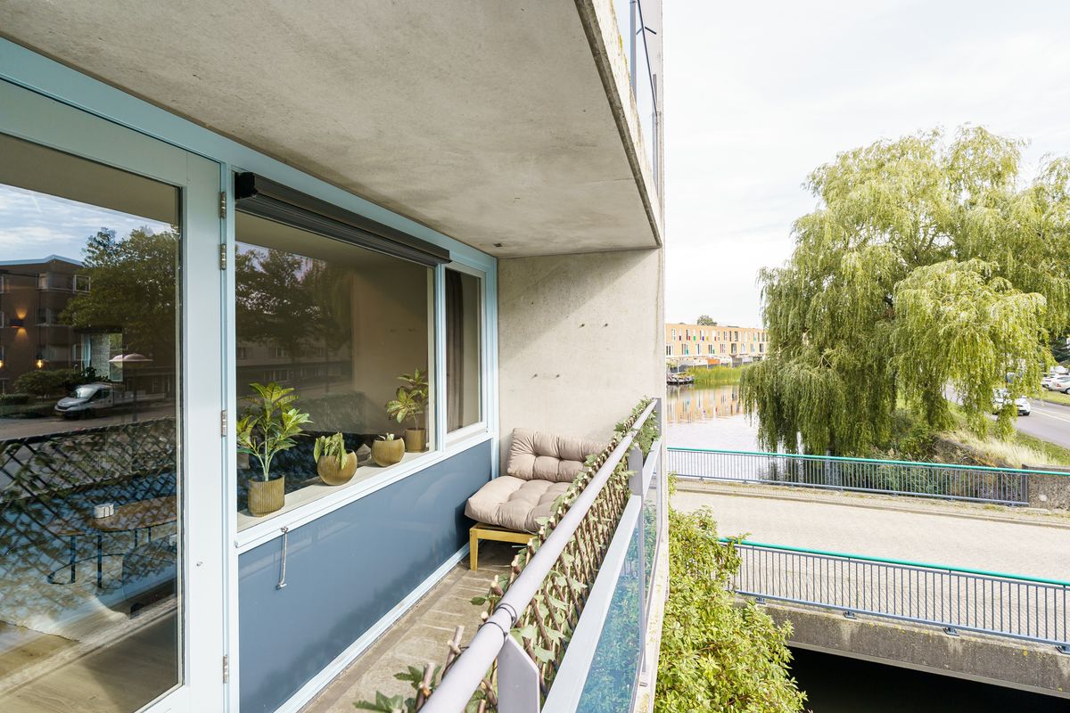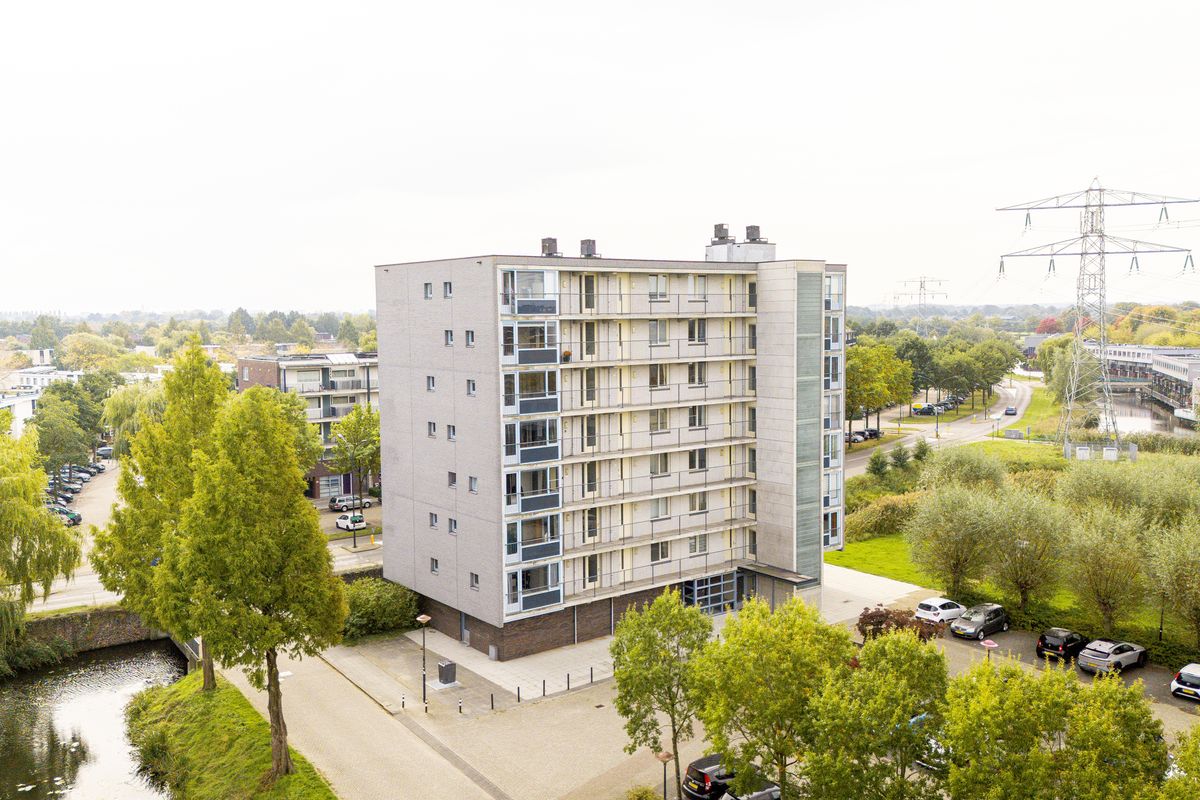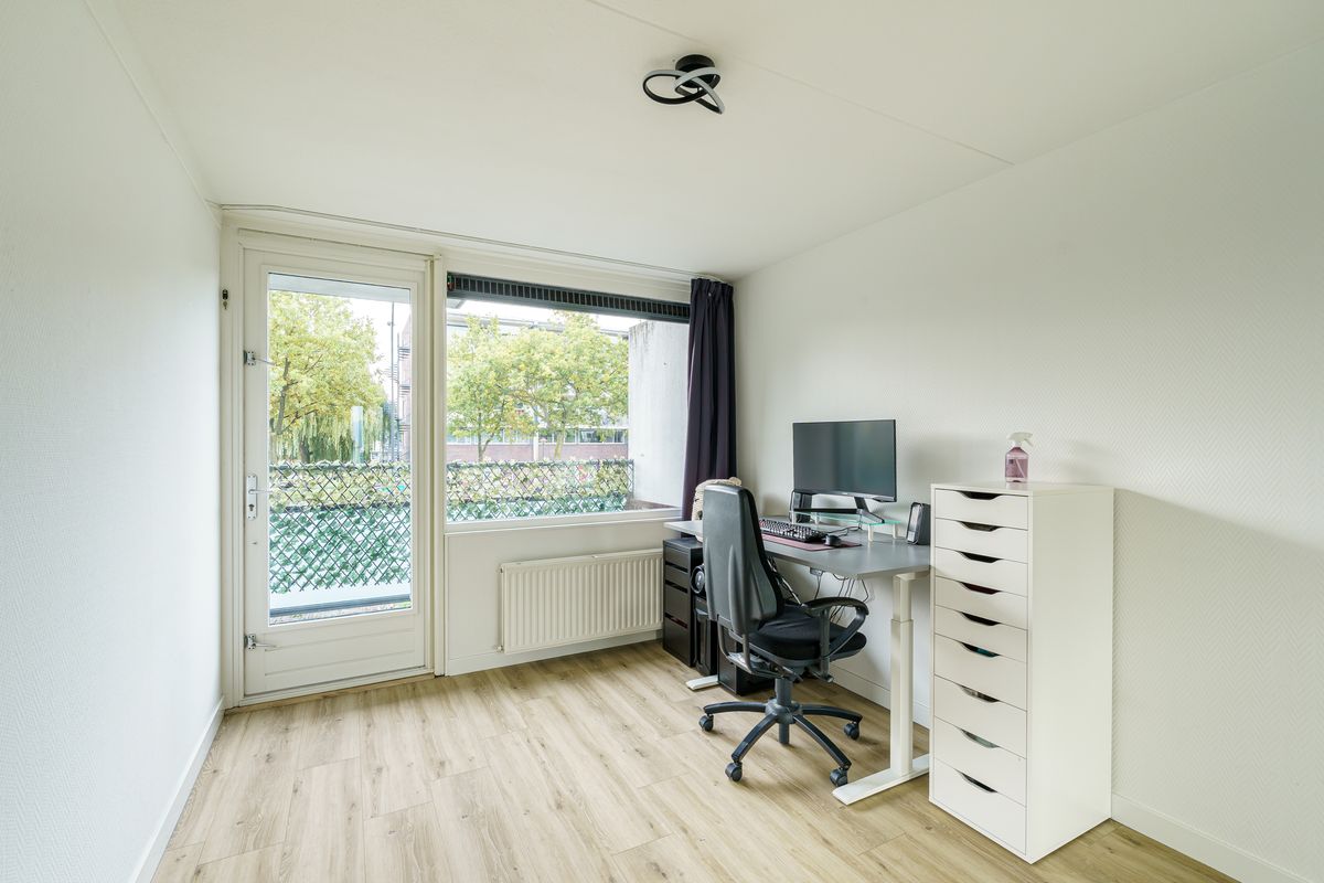 De woonkamer voelt extra ruim aan door het extra zijraam; een voordeel van de hoekligging van het appartement. Vanuit zowel de woonkamer als de achterste slaapkamer heb je toegang tot het woningbrede balkon. De tweede slaapkamer ligt aan de voorzijde van het appartement en is opvallend ruim, omdat de galerij ophoudt bij de voordeur en je daardoor extra ruimte hebt in de slaapkamer. De eerste verdieping is bereikbaar met de trap of met de lift.