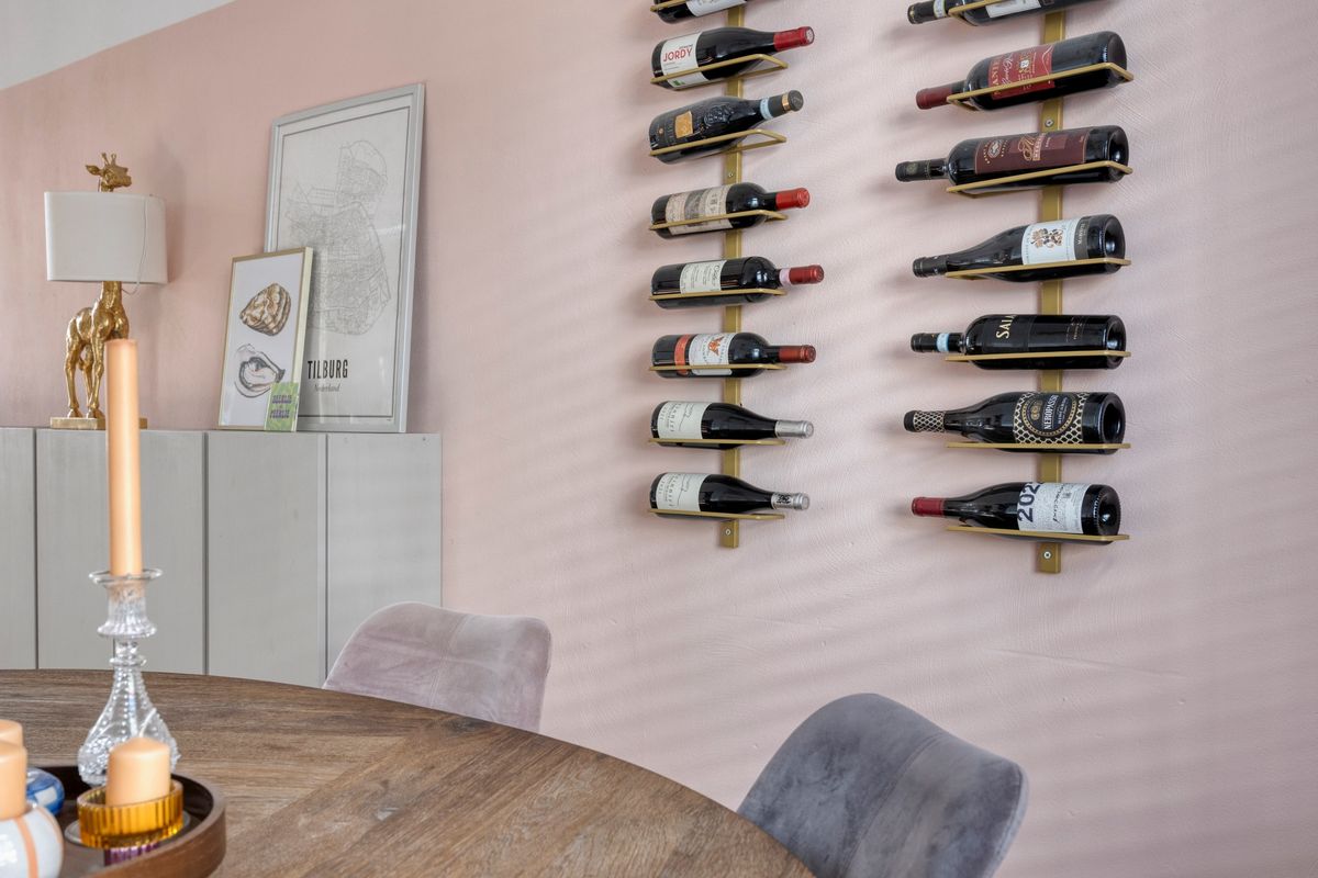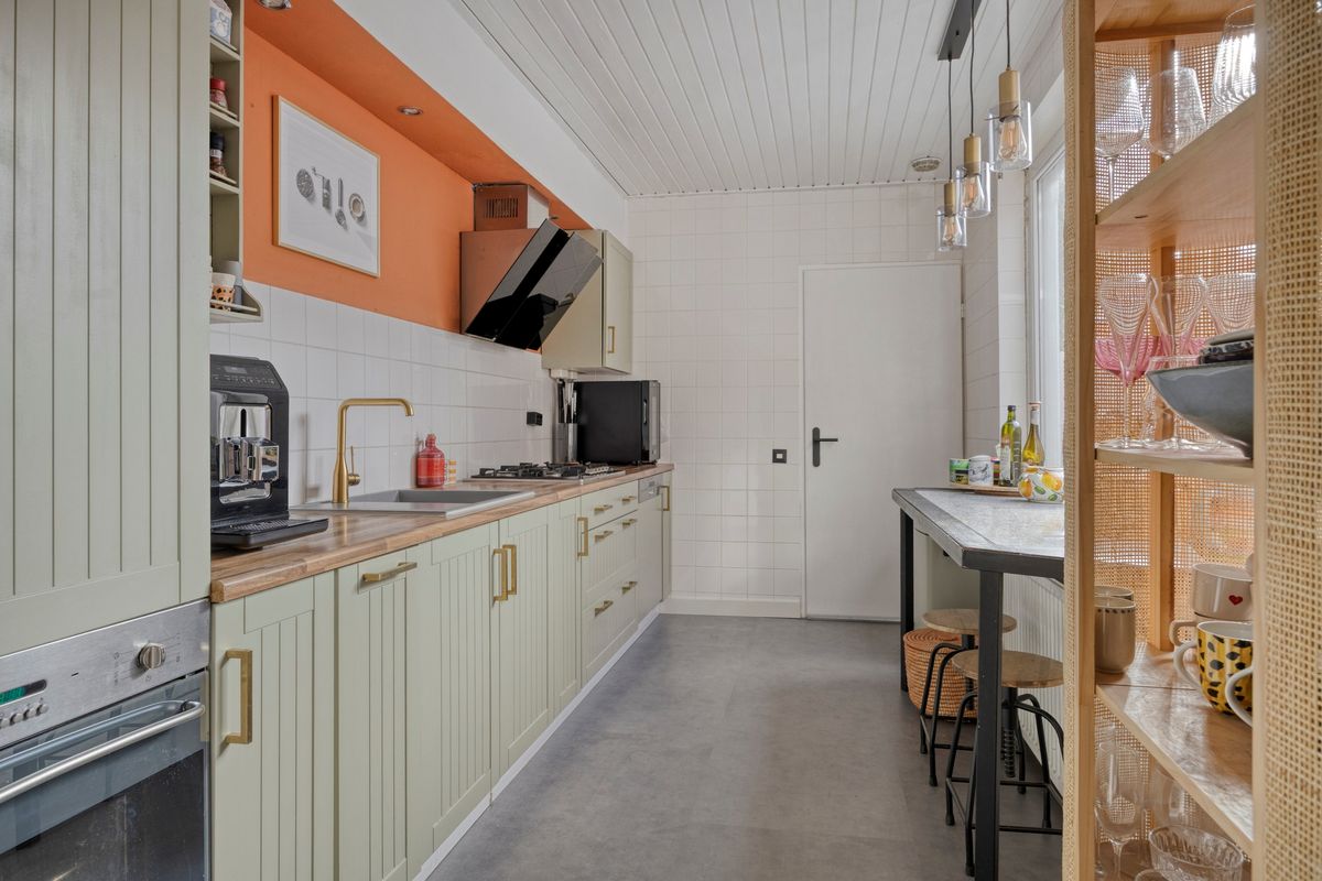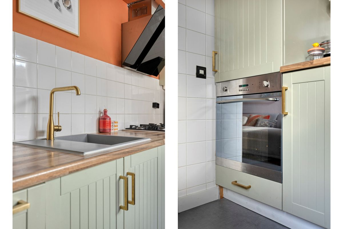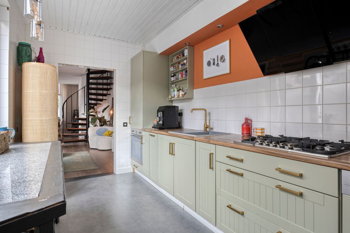 Aansluitend kom je aan in de keuken. Deze keuken met goudkleurige kraan en greepjes past qua sfeer helemaal in deze woning. De keuken is uitgerust met een vaatwasser (2022), 5-pitsgasfornuis, afzuigkap (2022), oven, koelkast en heeft meer dan voldoende bergkastjes waaronder een apothekerskast.