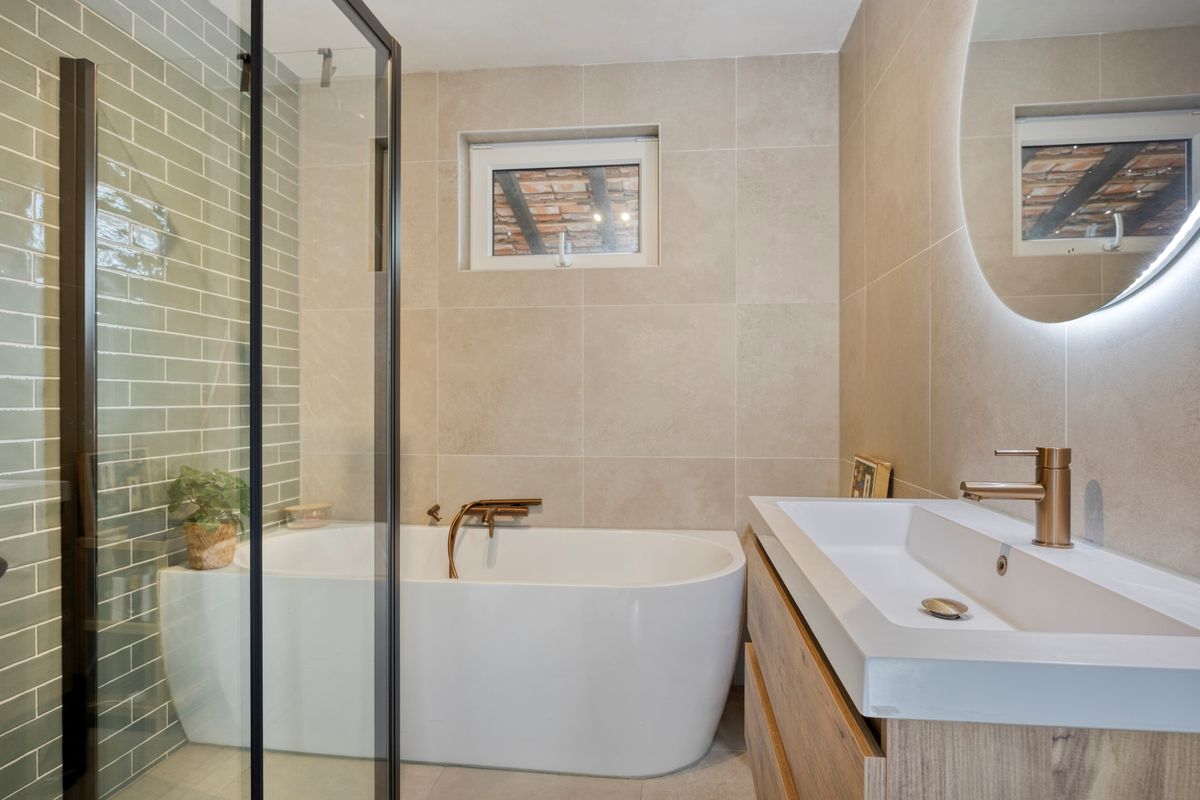 In dit sfeervolle huis uit 1906 vind je een verrassend moderne en stijlvolle badkamer die in 2022 volledig is gerenoveerd. De badkamer is daarnaast van alle gemakken voorzien. De ruimte is slim ingedeeld en combineert hedendaags comfort met een tijdloze uitstraling. De badkamer is uitgerust met een heerlijk ligbad voor de ontspannen momenten, een ruime douche met handig nisje voor je doucheproducten en een extra brede wastafel in een strak badkamermeubel. Ook is er een designradiator aanwezig en een raam waardoor er naast een mechanische ventilatie ook natuurlijke ventilatie mogelijk is.