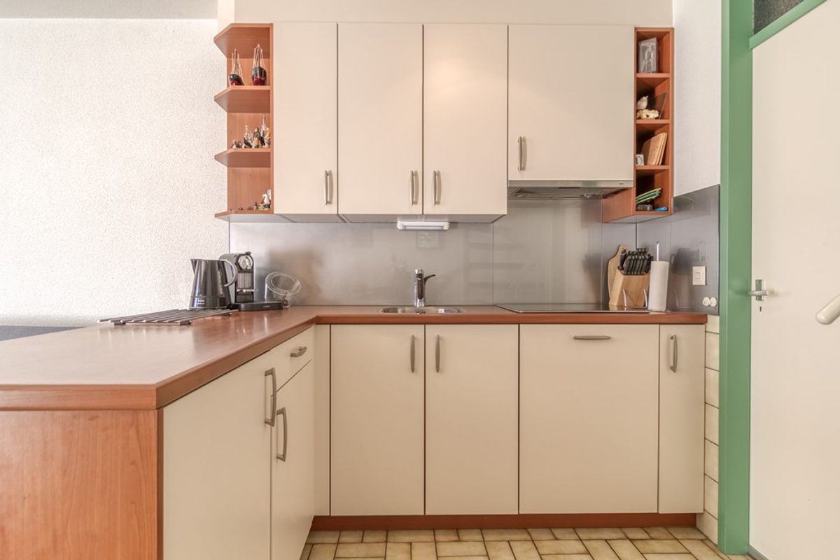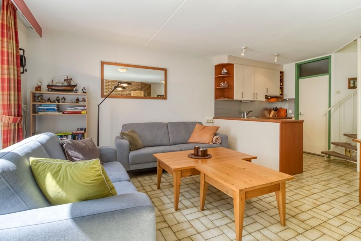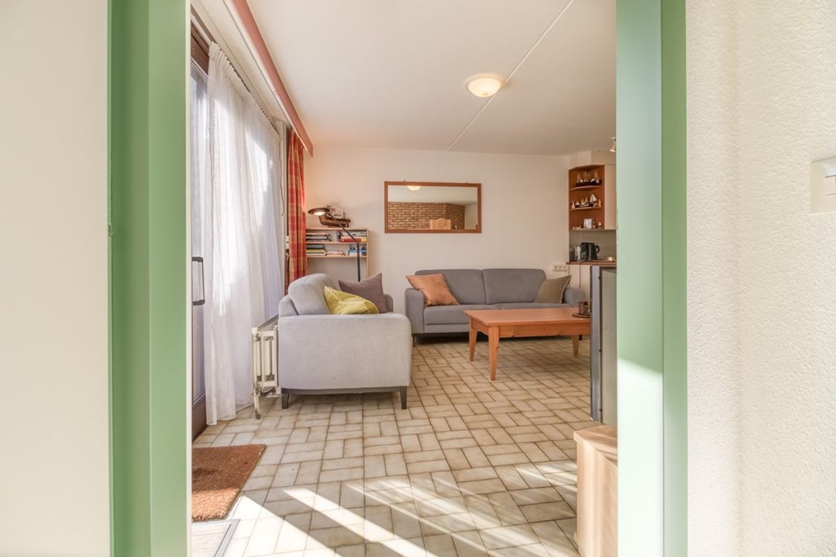 Via de entree komt u in de hal met meterkast en ruimte voor de garderobe. Vanuit de hal is er toegang tot de badkamer, een apart toilet met fonteintje en de woonkamer. De badkamer is voorzien van douche en wastafel. De woonkamer met zit- en eethoek heeft een schuifdeur naar het terras en staat in open verbinding met de keuken. De keuken in hoekopstelling is voorzien van; 4-pits keramische kookplaat, afzuigkap, spoelbak, koelkast en vaatwasmachine. Naast de keuken bevindt zich de bijkeuken met wasmachine, magnetron, diepvries en ruimte voor het opbergen van huishoudelijke spullen.