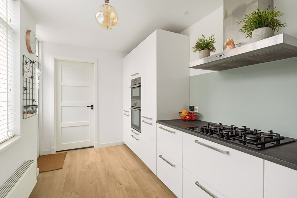 De lichte en zeer sfeervolle woonkamer is voorzien van hoge plafonds (ca. 2,75 m), een klassieke erker aan de voorzijde, openslaande deuren naar de tuin en heerlijk veel daglicht. In de uitbouw aan de achterzijde is de open keuken gesitueerd – modern en compleet ingericht met diverse inbouwapparatuur (o.a. vaatwasser, koelkast/vriezer, oven, afzuigkap). Via een achterdeur is ook vanuit de keuken de tuin bereikbaar.