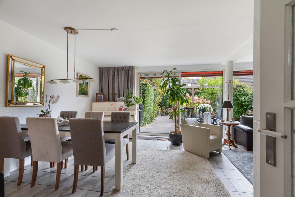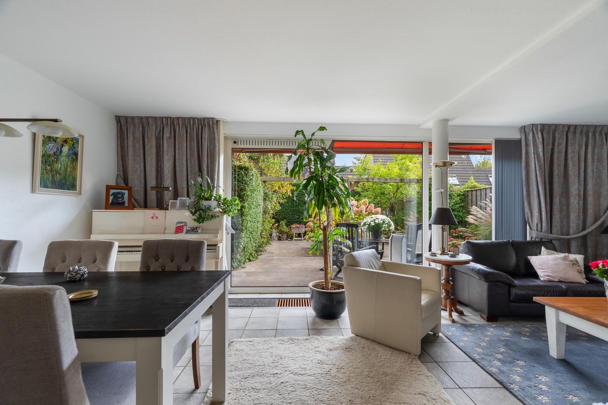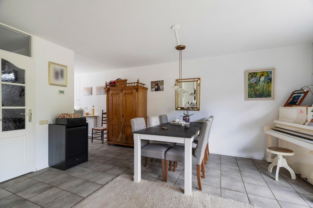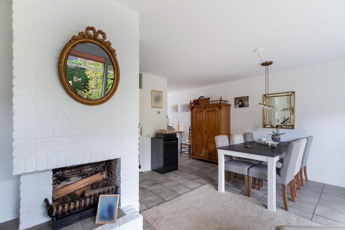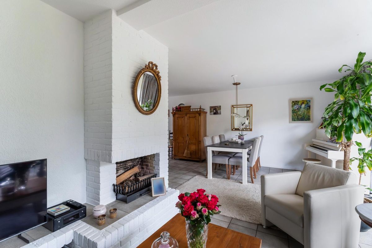 Via de verzorgde voortuin kom je binnen in de hal met toilet en trapopgang naar de verdieping. De woonkamer is opvallend licht dankzij de grote glazen pui aan de achterzijde. De vloerverwarming zorgt voor een aangenaam wooncomfort en de open haard geeft de zithoek extra sfeer. De open keuken is voorzien van recent geplaatste inbouwapparatuur van Siemens (2021: oven, afzuigkap en inductiekookplaat). Vanuit de woonkamer stap je zo de zonnige tuin in. Daarnaast beschikt de woning over een ruime garage van ca. 18 m² — ideaal voor een auto, hobbyruimte of om bij de woning te betrekken.