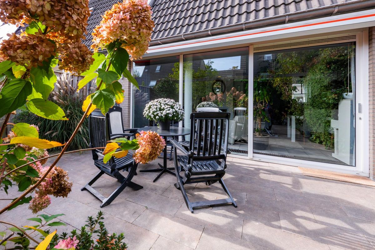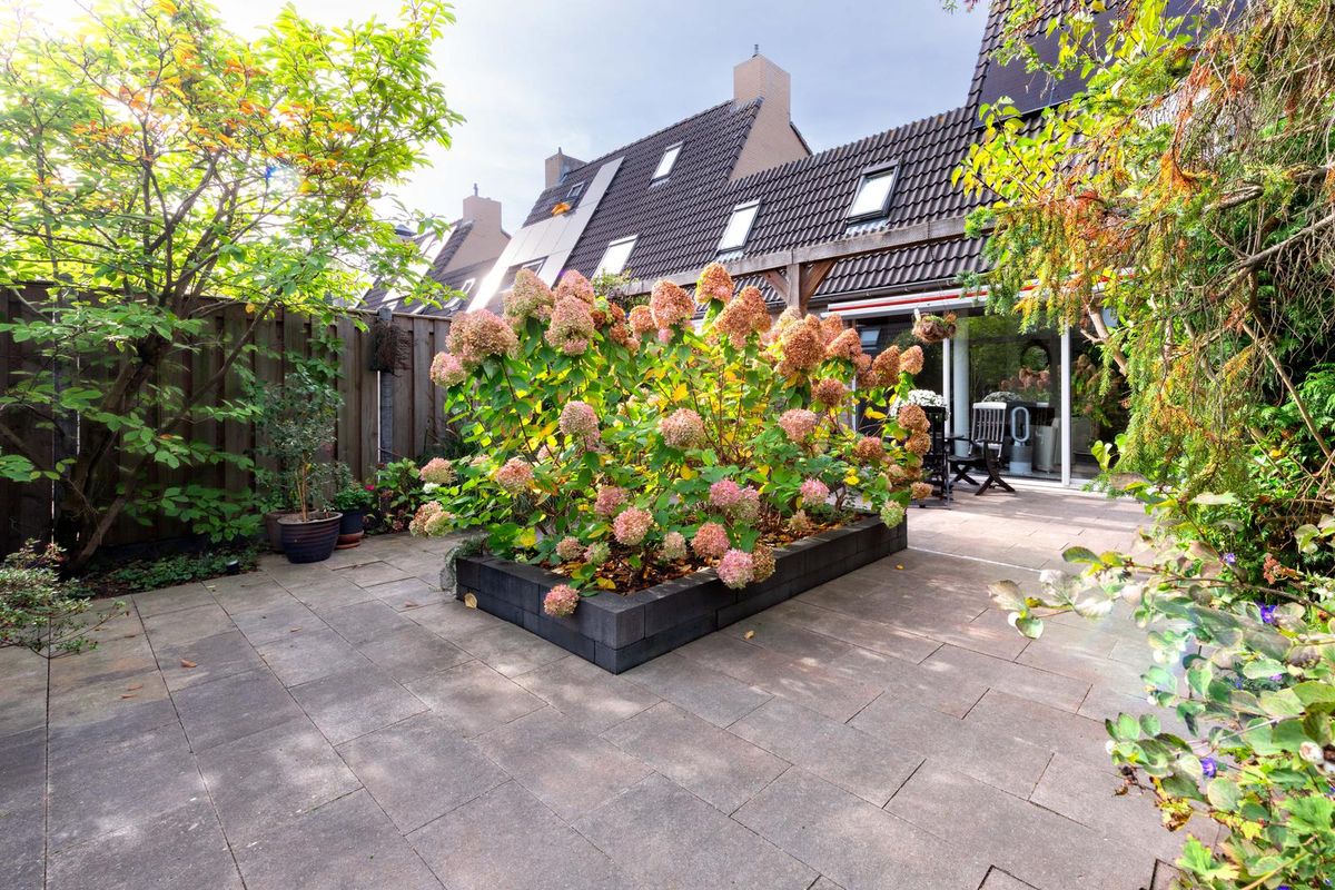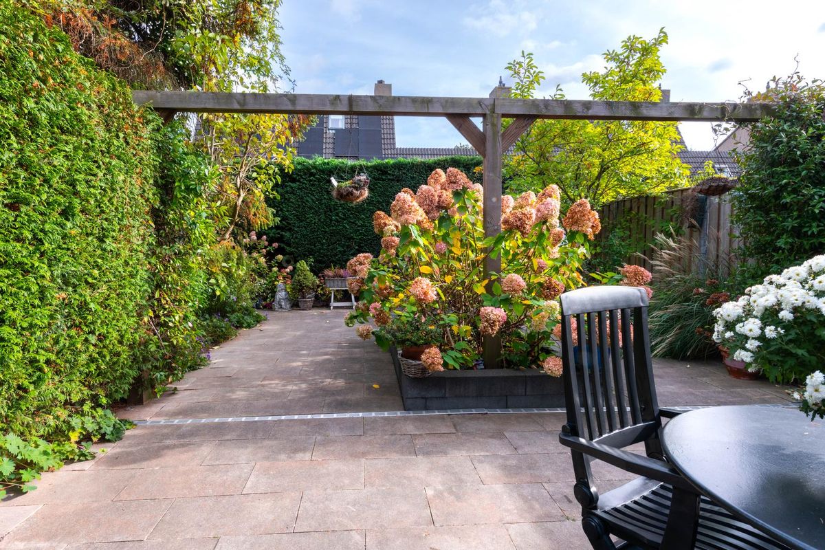 De fraai aangelegde achtertuin ligt op het zuidoosten en biedt volop privacy. Dankzij de zonwering kun je hier het hele seizoen genieten van de zon.