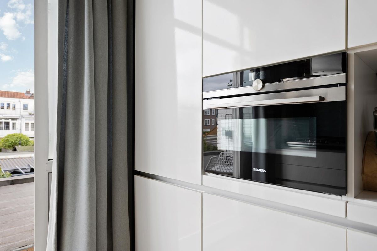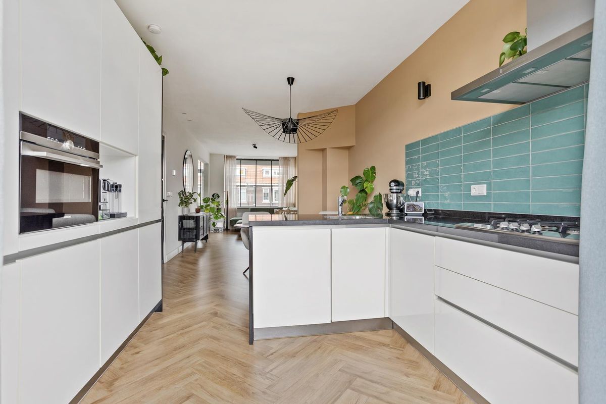 Aan de achterzijde bevindt zich de moderne open keuken, compleet uitgerust met inbouwapparatuur zoals een vaatwasser, combi-oven/magnetron, koelkast, vriezer, 4-pits gasfornuis en afzuigkap.