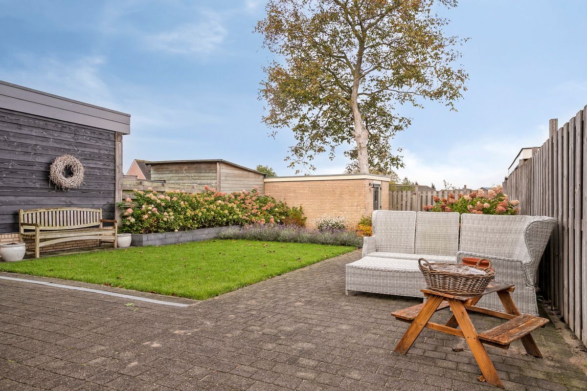 Achterin de tuin staat een vrijstaande berging — perfect voor fietsen, tuingereedschap of hobbyspullen.