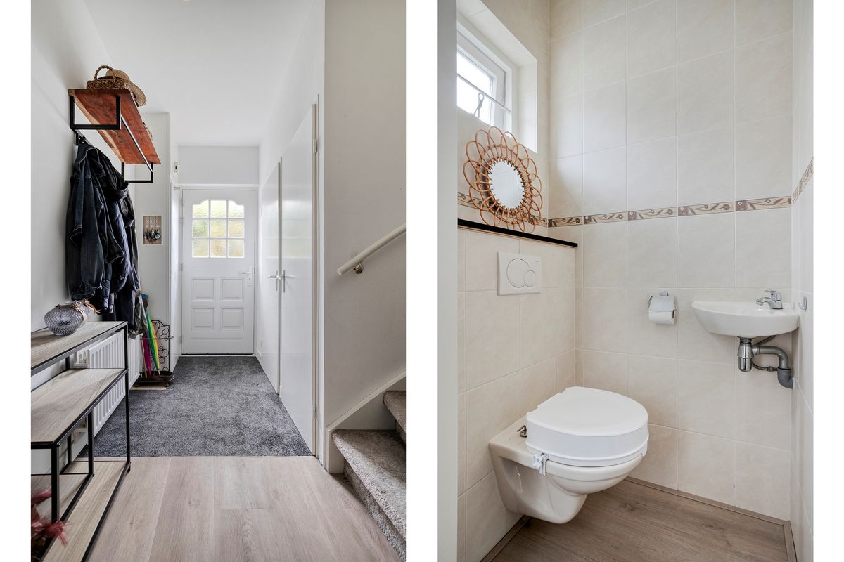 Via de voordeur kom je in een ruime hal met meterkast, vast kast, toilet en trapopgang naar de 1e verdieping.