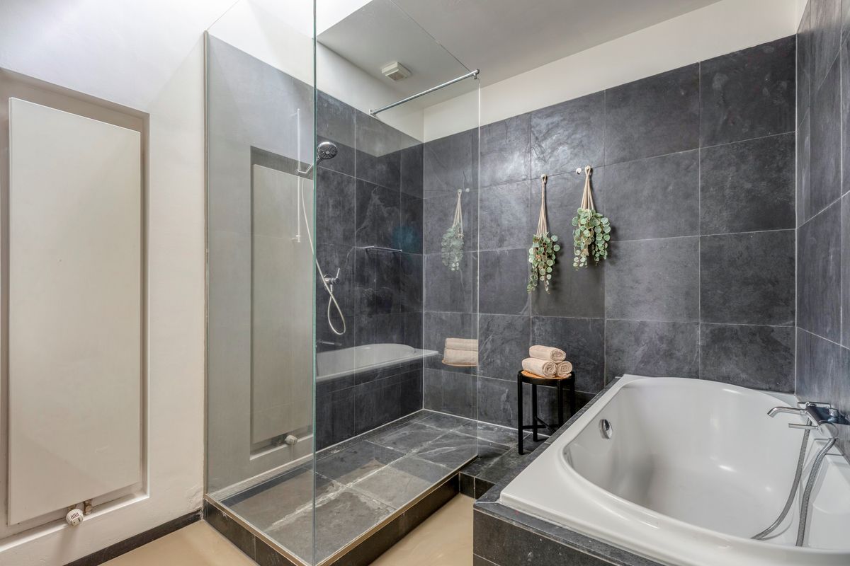 De luxe badkamer is centraal gelegen en beschikt over een ruime inloopdouche, een ligbad en een modern wastafelmeubel. Aan de rustige achterzijde liggen nog twee slaapkamers, waarvan één voorzien van een inloopkast.
