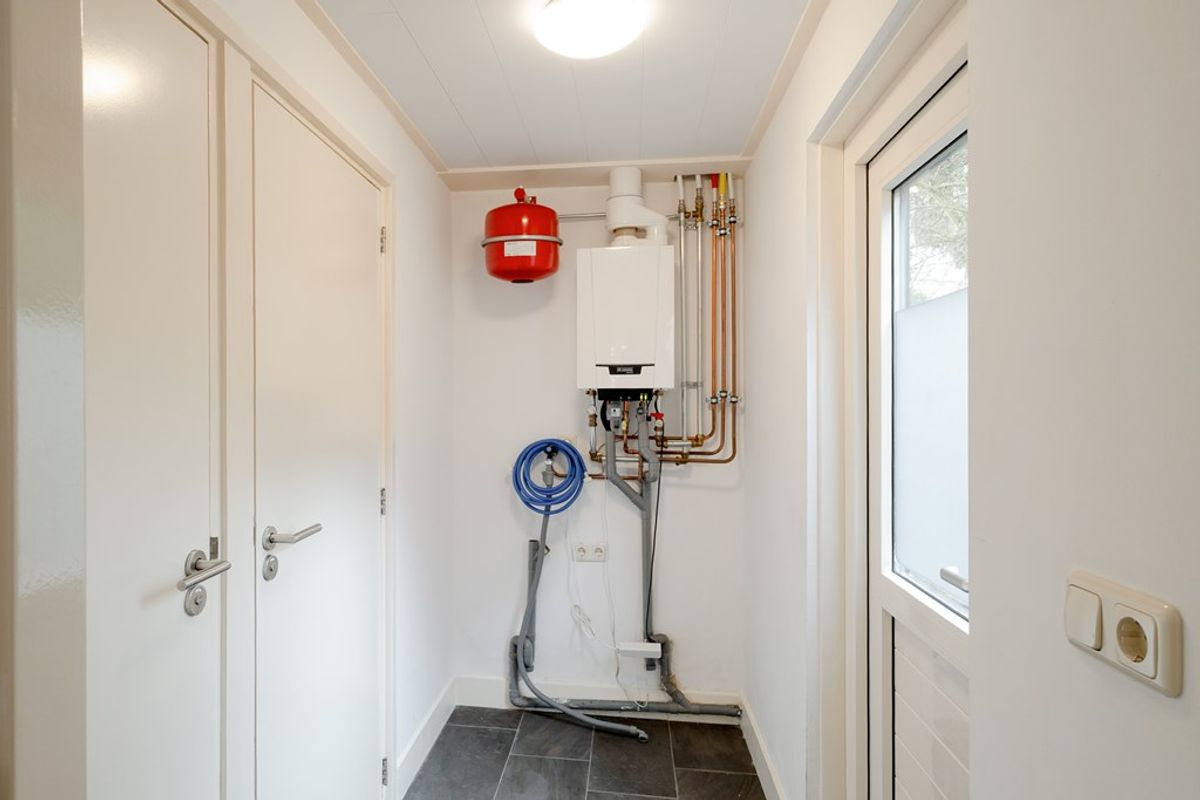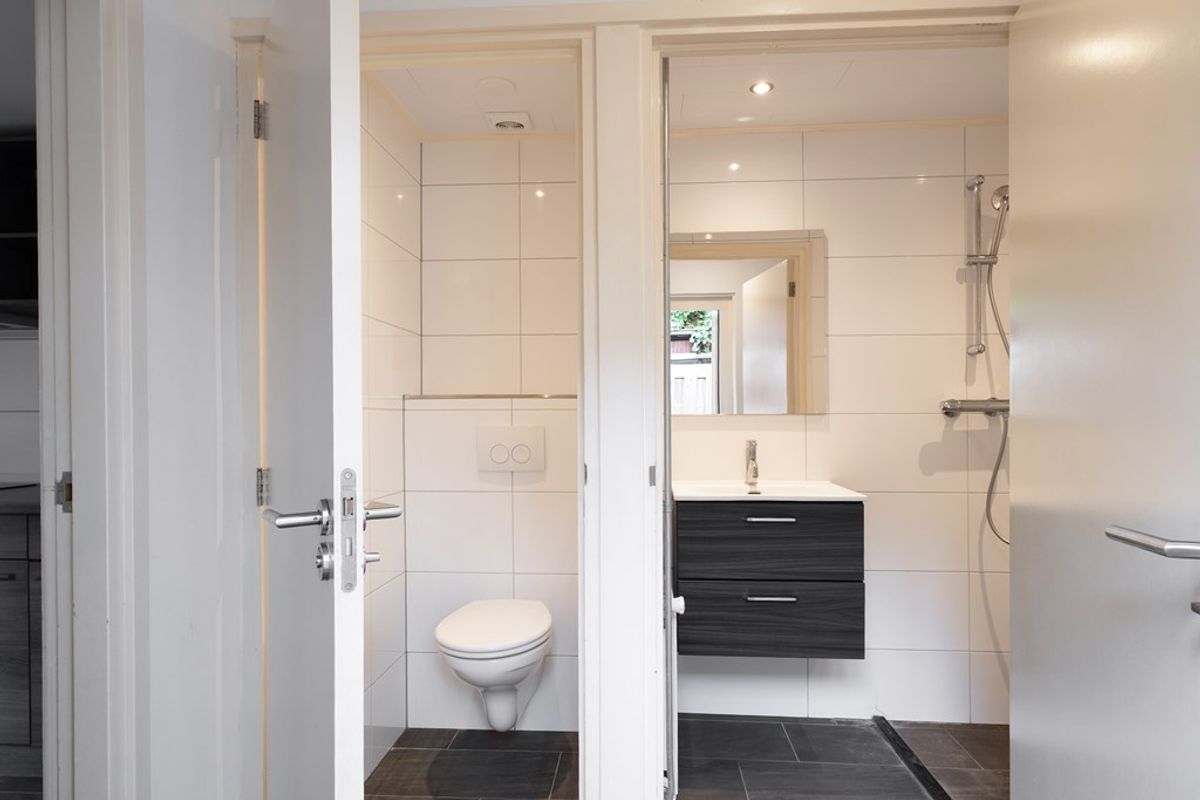 De keuken staat in directe verbinding met een handig halletje, dat toegang biedt tot de tuin, de badkamer en het separate toilet op de begane grond – een fijne en functionele indeling.