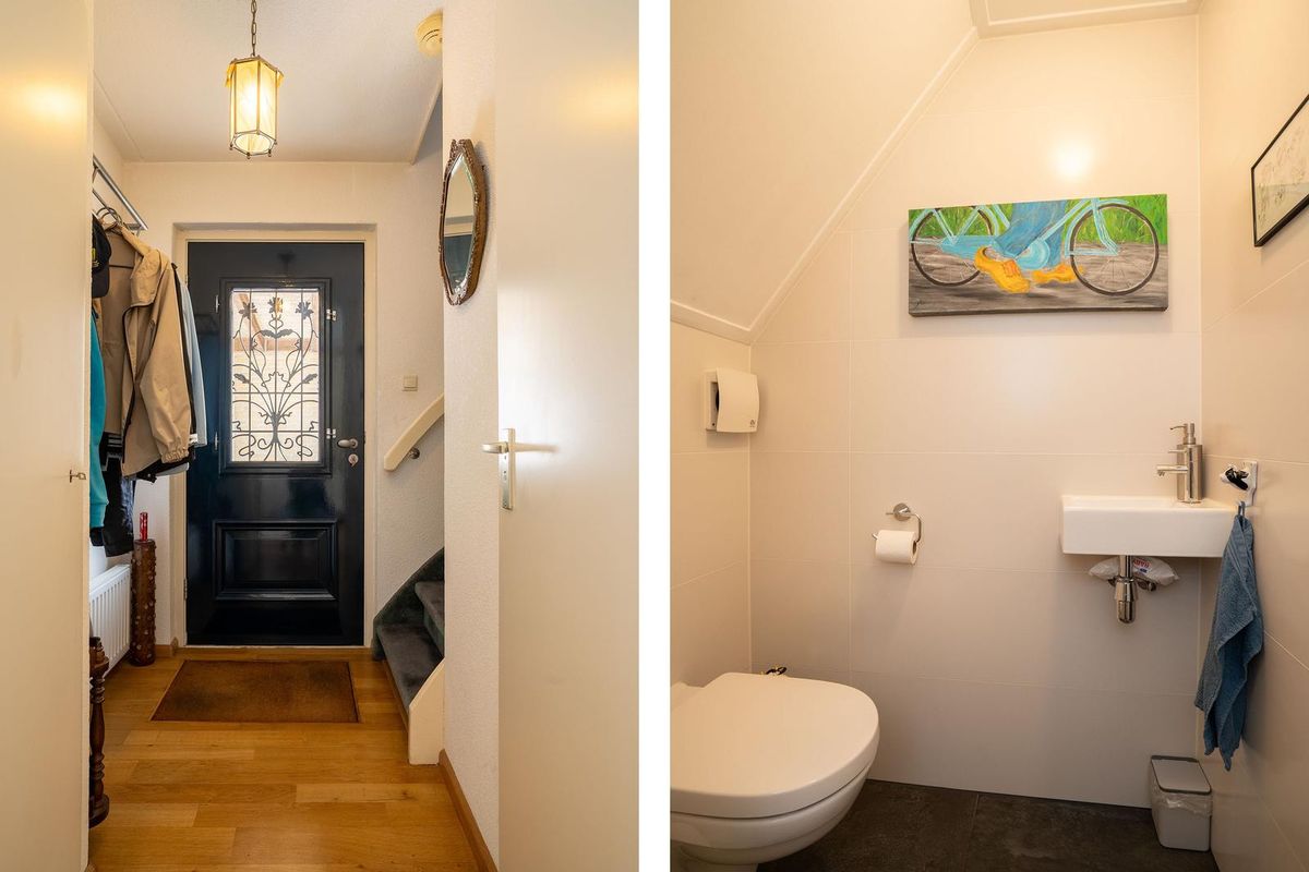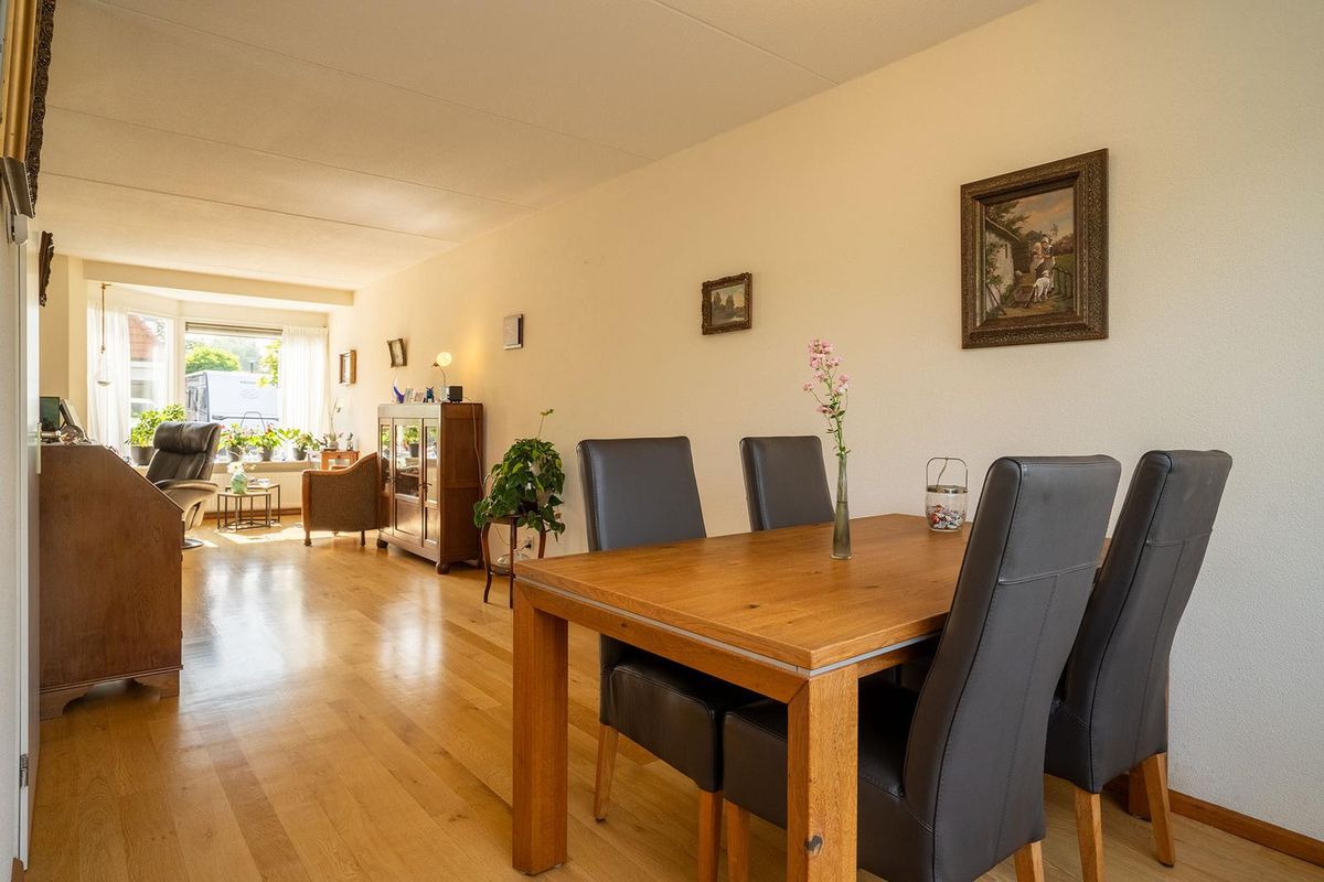 Begane grond: Via de entree met toilet en trapopgang bereikt u de ruime woonkamer. Dankzij de erker aan de voorzijde is er veel lichtinval en extra ruimte. De woonkamer loopt door in de eetkamer, die in open verbinding staat met de keuken. De keuken is functioneel ingericht en biedt toegang tot de tuin.
