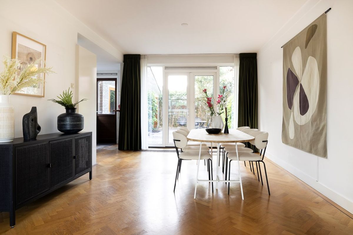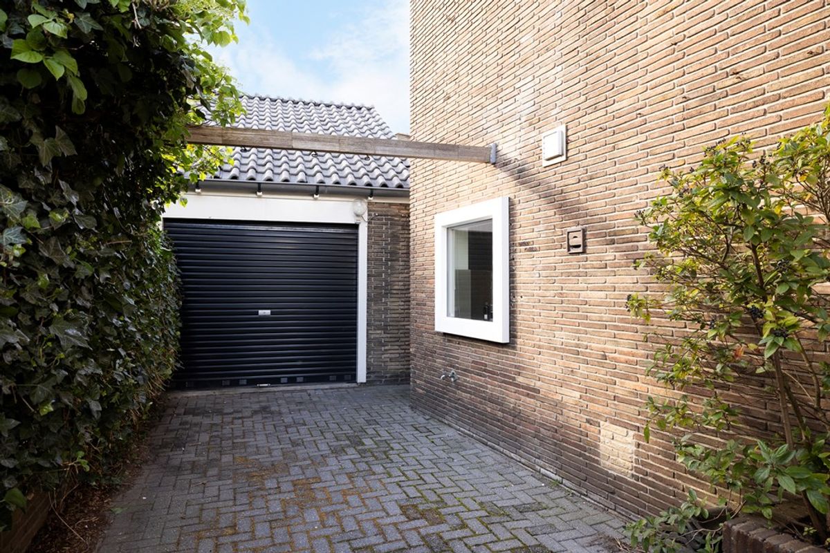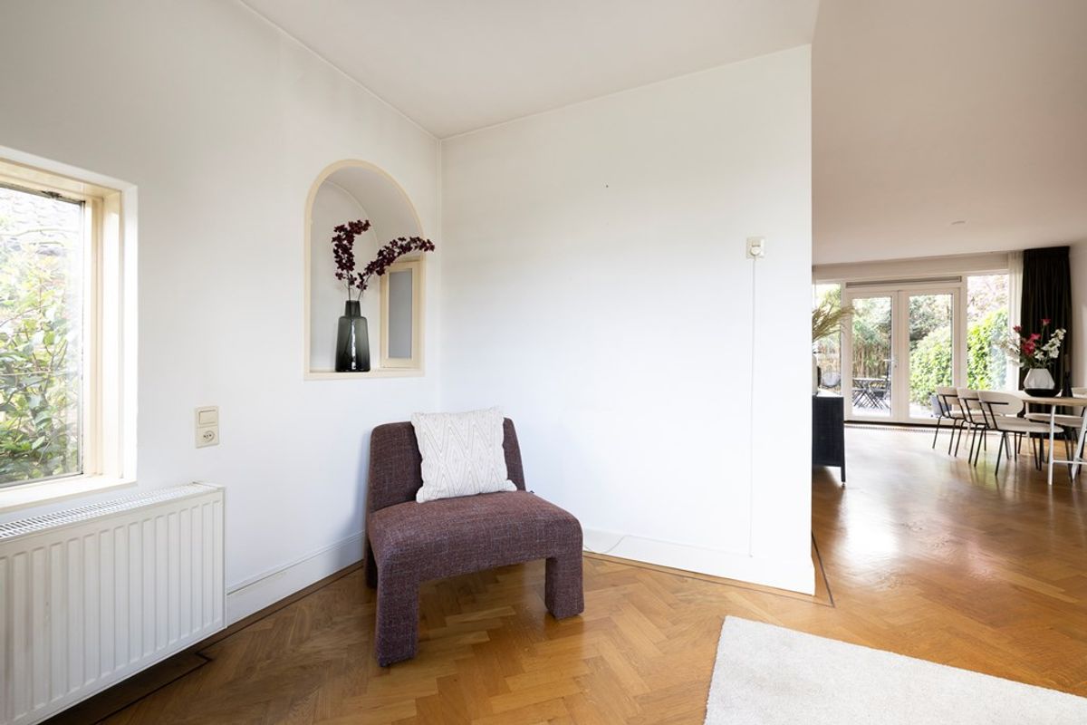 Via de oprit die ruimte biedt aan twee auto's kom je aan de zijkant van het huis bij de voordeur. Hier kom je in de vestibule met meterkast en toegang tot de gang. Via de gang heb je toegang tot de trap naar de eerste verdieping, het eerste toilet met fonteintje en de woonkamer met open keuken. Aan de voorzijde van de woning is de woonkamer extra breed en vind je de typisch jaren 30 erker. De woonkamer is voorzien van een moderne airco die kan verwarmen en koelen. De woonkamer is voorzien van een hardhouten visgraatvloer met bies. Aan de achterzijde van de woning vind je de keuken en openslaande deuren naar de zonnige achtertuin. De keuken is kwalitatief maar iets ouder. De apparatuur is onlangs vernieuwd met kwalitatief goede inbouwapparatuur. De achtertuin is gelegen op het noordwesten en daar geniet je van 's ochtends tot 's avonds van de zon. De garage is via de oprit met een roldeur te openen en via de tuin te bereiken middels een extra deur. De garage heeft een nokhoogte van 4,60m en heeft een vliering wat veel bergruimte geeft. De garage is groot genoeg voor een moderne grote auto. Achter de garage vind je de aangebouwde stenen berging die via de tuin is te bereiken.
