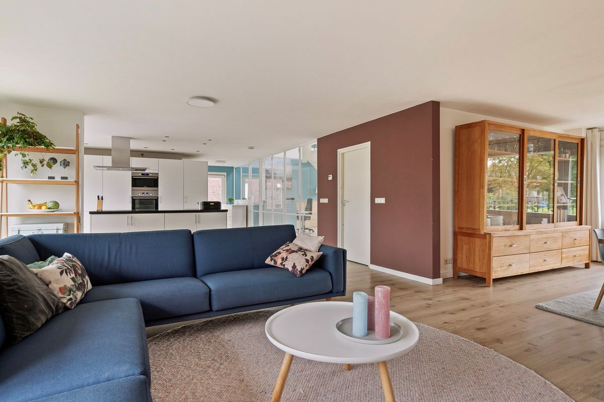 We gaan terug naar binnen. De woonkamer is enorm en biedt meer dan genoeg ruimte om allerlei opstellingen te maken. De lange ramen aan de achterzijde bieden zicht op het groen van de tuin en verbinden de woning met buiten. Op een winterdag naar buiten kijkend met aangenaam warme voeten van de vloerverwarming is het hier goed toeven. Met het vele daglicht, de grote raampartijen, voorzien van screens, en de algehele afwerking is het helemaal af. Het is een sfeervol uniek huis waar je zo in kan trekken.