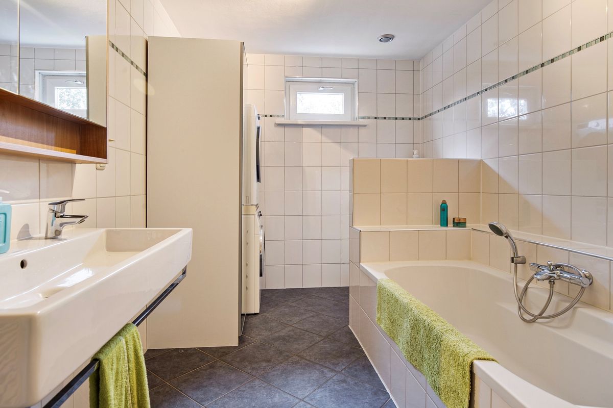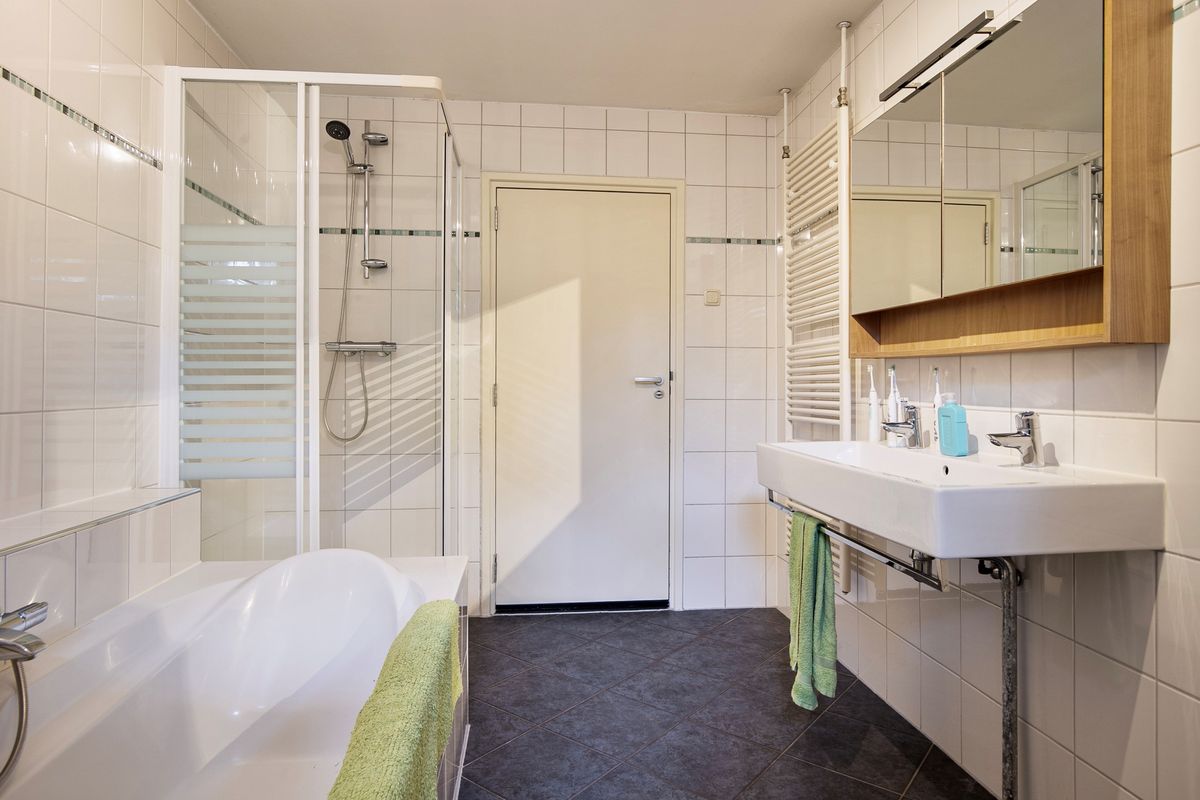 Vanuit de woonkamer is er toegang tot de eerste badkamer. De badkamer is voorzien van een ligbad, heel handig met kinderen, een aparte douche, een brede wastafel, de wasmachineaansluiting en het eerste toilet. Als je op deze etage ook een slaapkamer wilt creëren is een badkamer op die etage ook erg prettig.