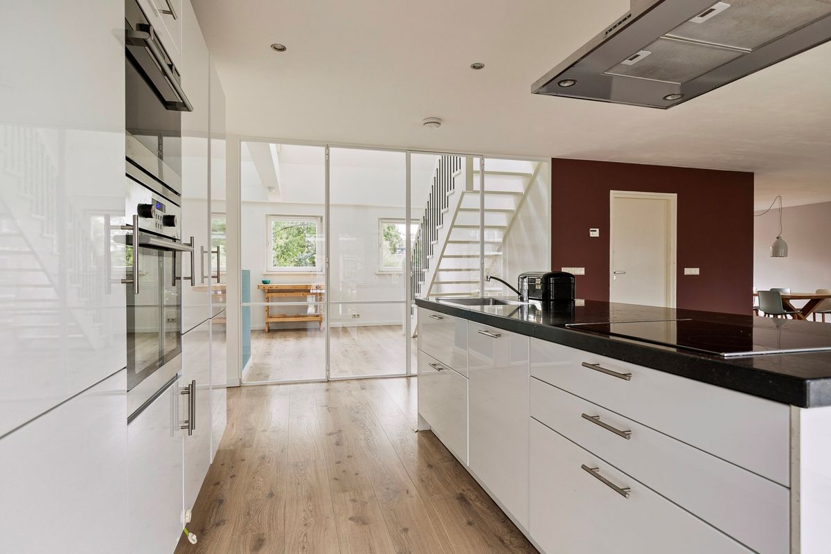 Standing in front of the house, we see the driveway that is shared with the neighbors. The spacious garage (24m²) belonging to the apartment is accessible via the driveway and has a pedestrian door in the up-and-over door, making the use of the garage even easier. The garage is roomy enough for a modern car, but also offers storage or hobby space. The roof of the garage has a green sedum roof. Via the same driveway, we reach the side of the house where the striking door is the main entrance to the house. Upon entering, we can immediately look up to the ridge from the first steps and we immediately see the space and lightness of the house when going up the stairs. Once upstairs, we fall silent for a moment. The space is gigantic, with light all around and a view of the garden, the greenery around the house and the sun pleasantly entering the house through the many windows. From the stairs we enter the ‘hall’ with the kitchen and the utility room. The utility room offers plenty of storage space and houses the HR combi boiler (2009). The kitchen is modern with an oven, combi microwave, refrigerator, separate freezer, anisland with natural stone countertop, induction hob, large sink, dishwasher and cupboard space in the back wall. From the kitchen there is access to the spacious roof terrace. Facing northwest, it is generously sized at 23m² and you can enjoy the sun here from noon until late in the evening. For warmer days, the roof terrace is also equipped with an electric sun awning (2024), which provides the roof terrace with the necessary shade. The terrace offers a view of the sedum roof, which blooms beautifully in various colours in the summer. From the roof terrace, there is a fixed staircase to the back garden that may be used by the apartment under certain conditions. We will, of course, explain all this during the viewing.