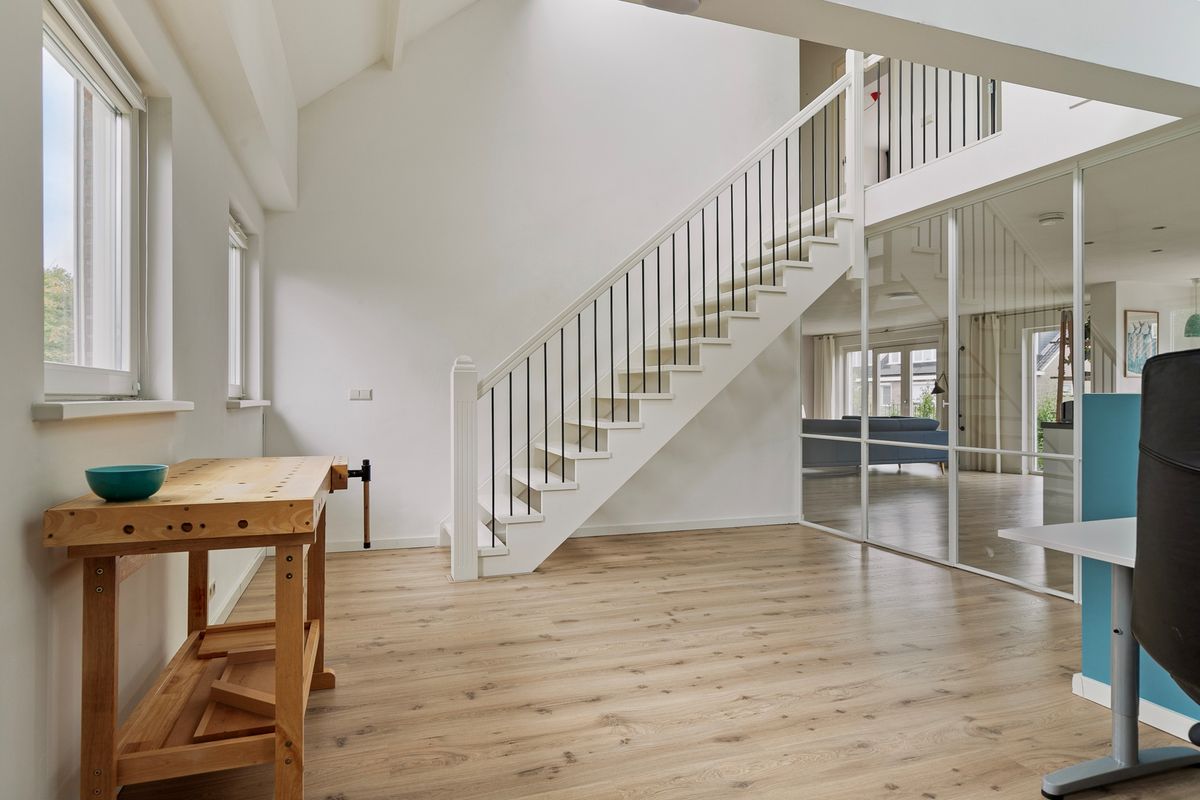 Let’s go back inside. The living room is huge with more than enough space to offer plenty options for arranging your furniture all kinds of ways. The long windows to the rear offer views of the greenery of the garden and the surroundings and bring outside in. On a winter's day, looking outside with pleasantly warm feet from the underfloor heating, it is a great place to be. With the abundance of daylight, the large windows with screens and the overall finish, it is completely finished. It is an atmospheric and very unique house that you can move into right away. The first-floor bathroom is accessed from the living room. The bathroom has a bath, separate shower, wide basin, washing machine connection and toilet – really handy with small children. At the front of the house there is a multifunctional space that offers many possibilities. Dining room? Hobby room or game room, office, lounge or extra living room? Everything is possible. The height of this space is special and unique. In particular, the roof trusses have been left visible allowing you can see all the way to the ridge and the three Velux roof windows allow in a lot of light. In this space there is also the staircase to the second floor that comes up on a mezzanine with the entire height of the house in view. There is a long landing with high fanlights above the doors on the long sides, framing the roof trusses. All bedrooms on this floor make the best use of the available space due to the large dormers that were added at the front and back in 2009 and, like the rest of the house, are neatly plastered and finished. In all rooms, there is a great feeling of space and tranquility due to the height that has been opened up to the ridge. There are no fewer than 5 bedrooms, one of which is used as a walk-in closet. The bedrooms are all equipped with HVAC that can be used to heat or cool each room. All rooms, including the second bathroom, are equipped with external sunscreens (2023). The modern, luxurious second bathroom has underfloor heating, a double washbasin with vanity, a spacious walk-in shower and a second toilet. We can continue talking about this, but you have to come and see it for yourself. This house is ready for the future, absolutely "one of a kind" and suitable for anyone who loves space and luxury and does not want to renovate.