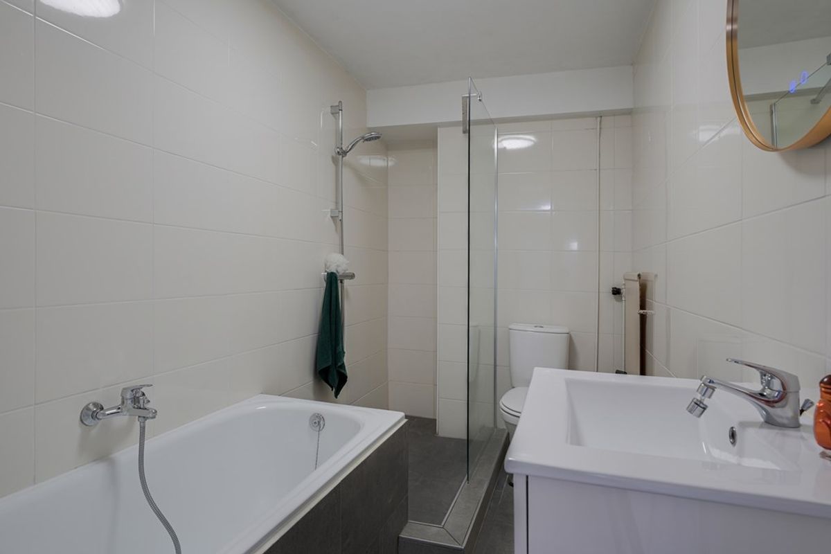 Aansluitend bevindt zich de praktische bijkeuken, met aansluitingen voor wasmachine en droger en toegang tot de tweede badkamer. Deze badkamer is uitgerust met een inloopdouche en wastafel, wat extra comfort en flexibiliteit biedt.