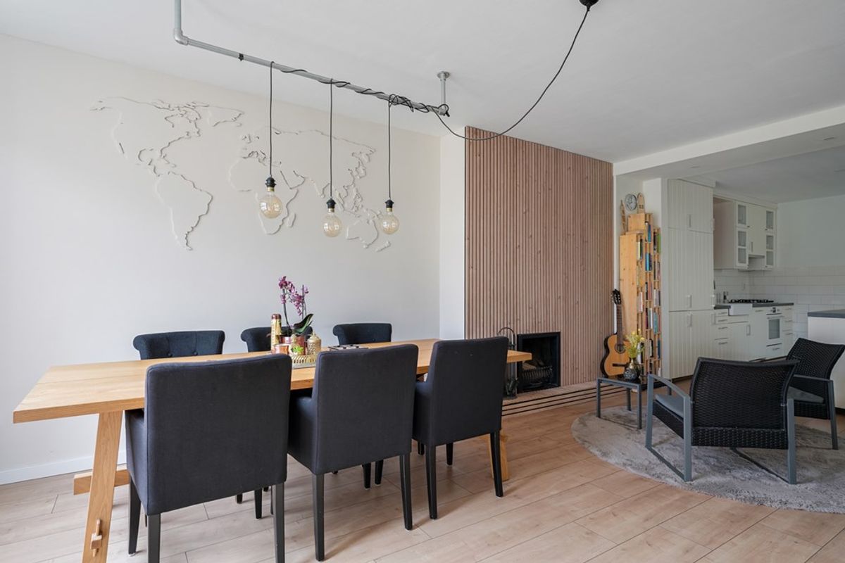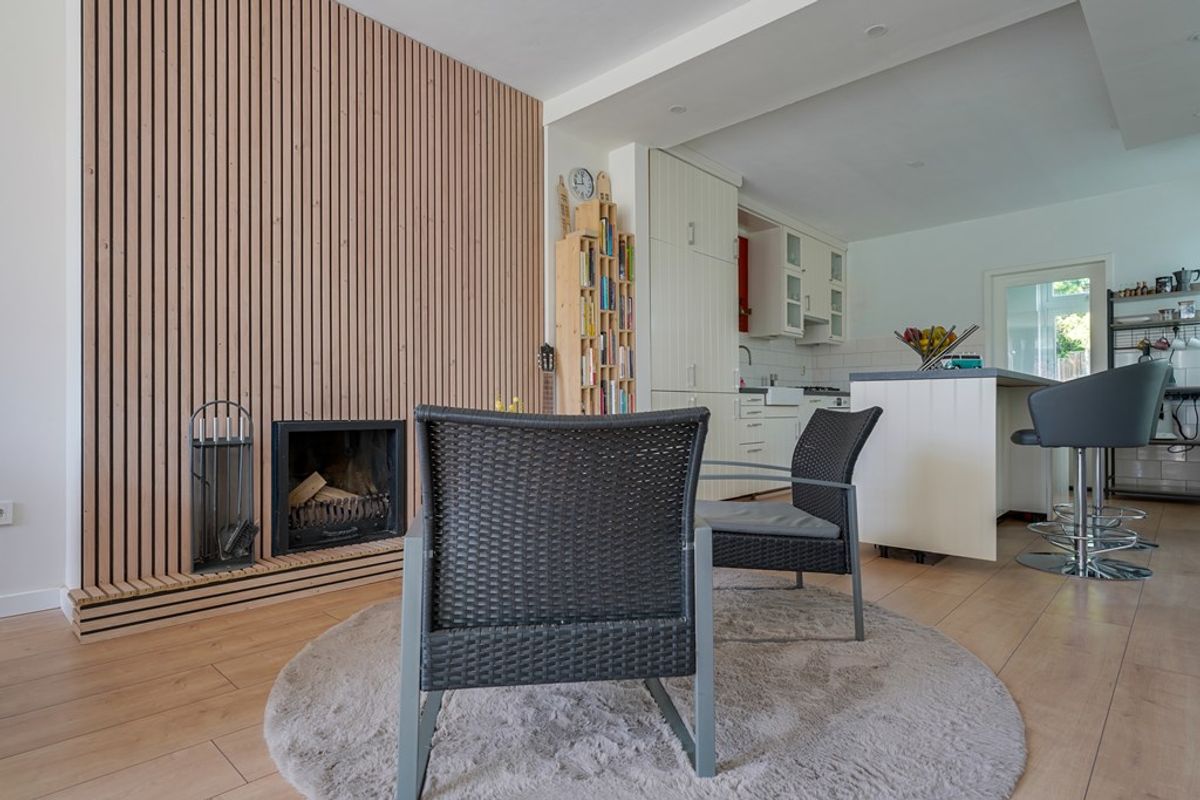 De ruime en lichte L‑vormige woonkamer vormt het hart van de woning. De sfeervolle open haard zorgt voor extra warmte en gezelligheid, terwijl de laminaatvloer en grote raampartijen bijdragen aan een moderne en comfortabele uitstraling. De prettige lichtinval en de aanwezigheid van de hardhouten trapopgang maken dit tot een fijne en uitnodigende leefruimte, perfect voor zowel ontspanning als gezellig samenzijn.