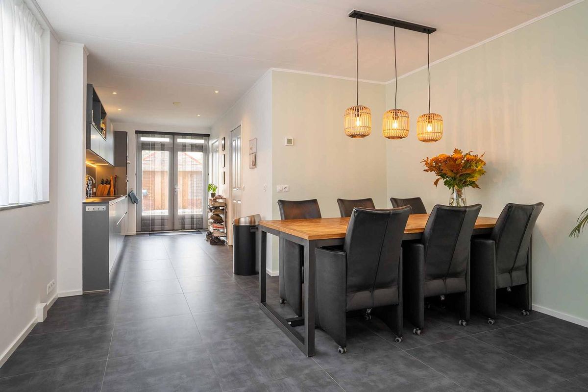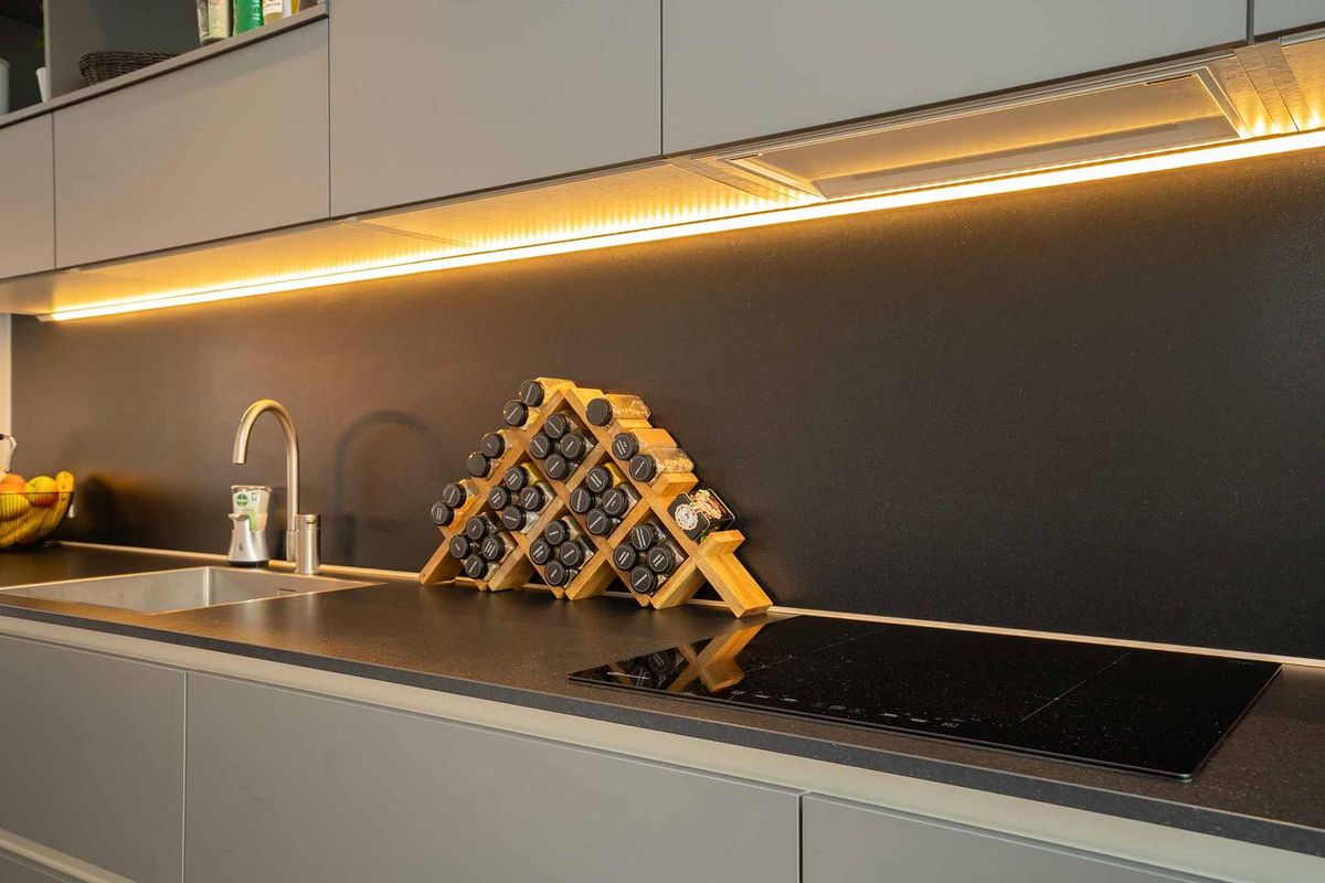 Begane grond: De lichte woonkamer vormt het hart van het huis. Dankzij de open indeling en de grote raampartijen is het er heerlijk ruim en aangenaam licht. De afwerking is modern, met een mooie tegelvloer voorzien van vloerverwarming die zorgt voor optimaal wooncomfort in elk seizoen. De eethoek sluit naadloos aan op de keuken, waardoor je een gezellige leefruimte hebt om samen te koken, te eten en te ontspannen. De moderne keuken is een echte blikvanger – strak vormgegeven, voorzien van inbouwapparatuur en afgewerkt met hoogwaardige materialen. De ingebouwde verlichting onder de kasten geeft niet alleen sfeer, maar ook functioneel licht op het werkblad.