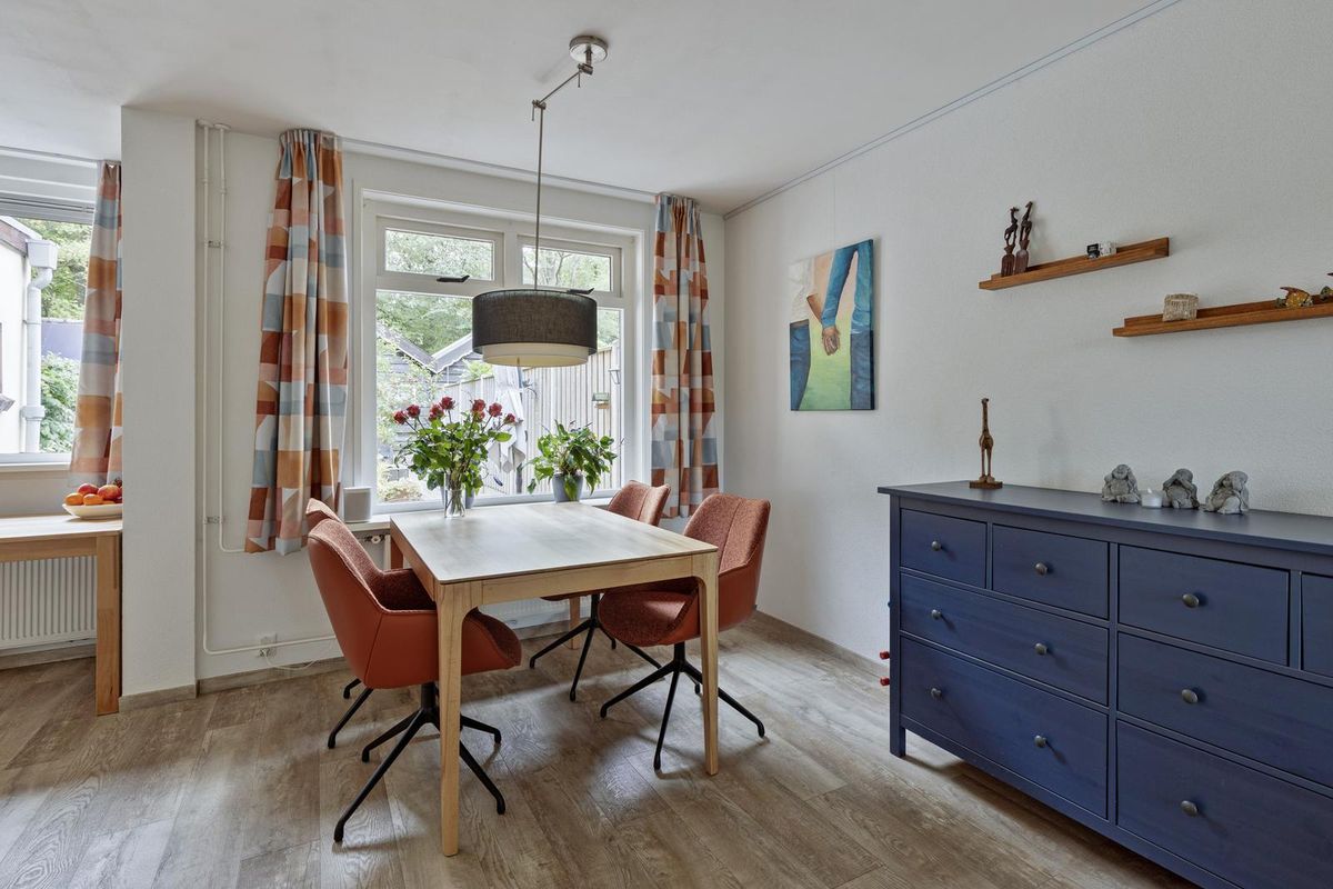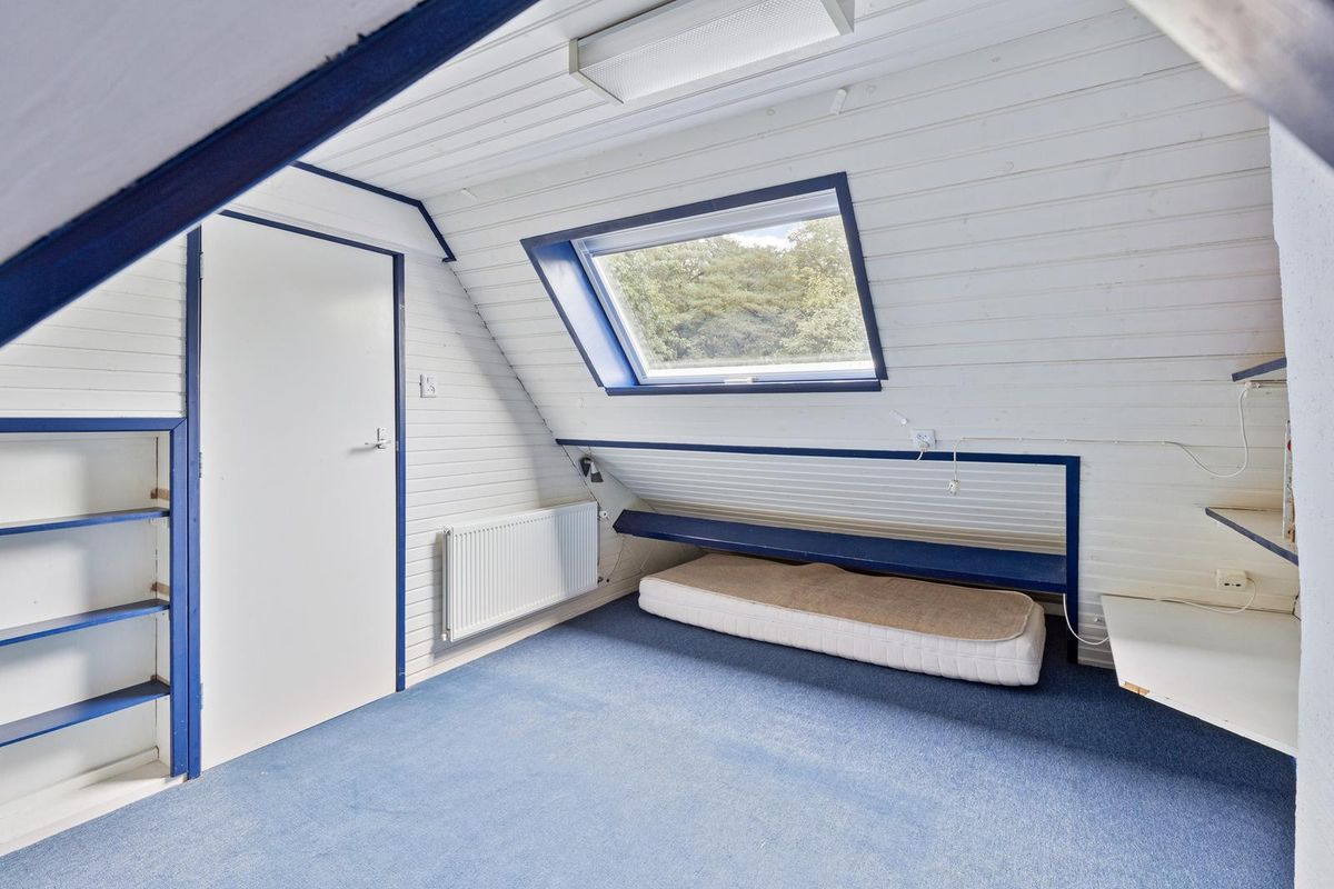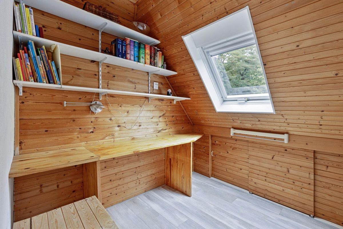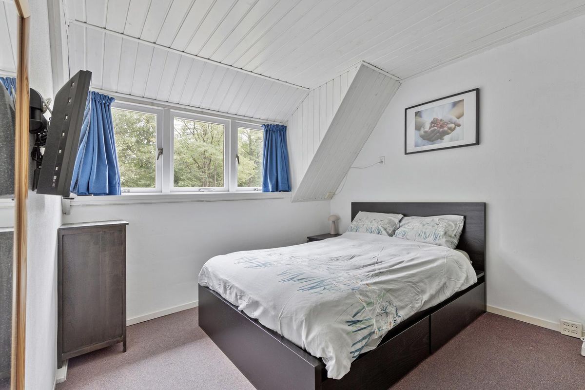 De achtertuin is een echt pluspunt: privacygericht, groen ingericht en voorzien van een ruime garage met bergzolder. Een fijne plek die volledig aansluit bij de bosrijke omgeving van de woning.