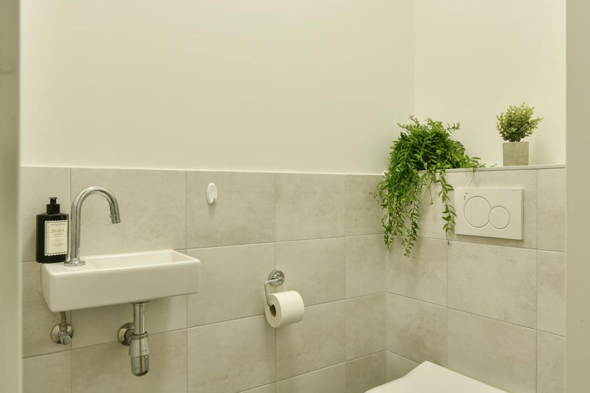 The neat bathroom is centrally located and therefore easily accessible, both from the hallway and from the first bedroom (en-suite). The bathroom has a walk-in shower with glass partition, again underfloor heating and cooling, double sink with large mirror, designer radiator, and a cabinet for storing towels and bathroom accessories. In terms of finish, large dark anthracite-colored floor tiles and cream sand-colored wall tiles ensure a hygienic situation. Adjacent to the bathroom is the separate toilet, which is finished in the same style as the bathroom.