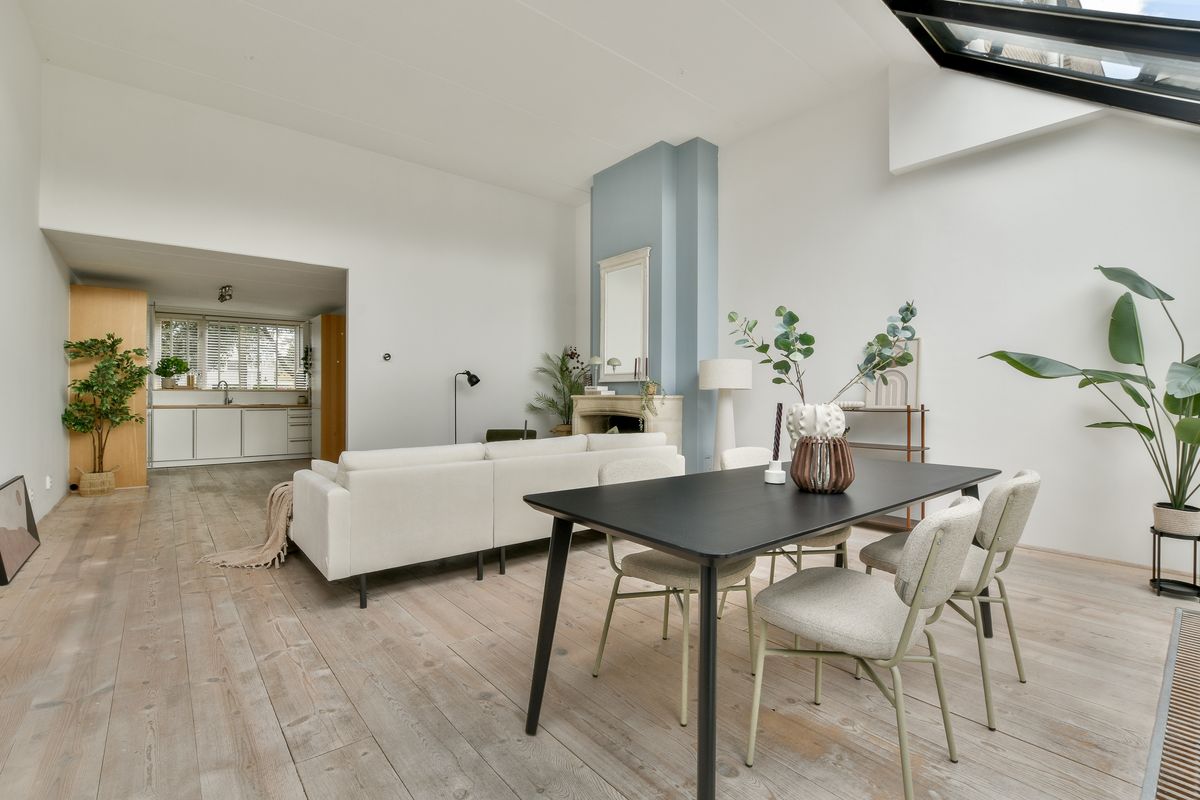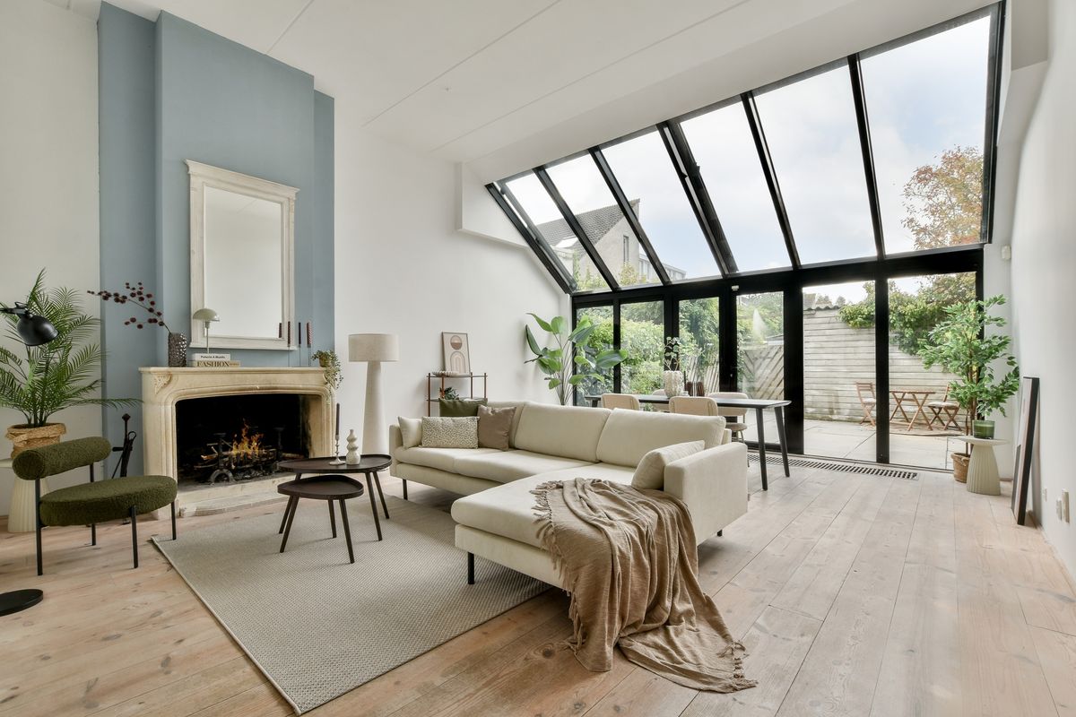 • Lichte woonkamer met parket vloer, sfeervolle natuurstenen schouw en hoogte van maar liefst 3,77 m
