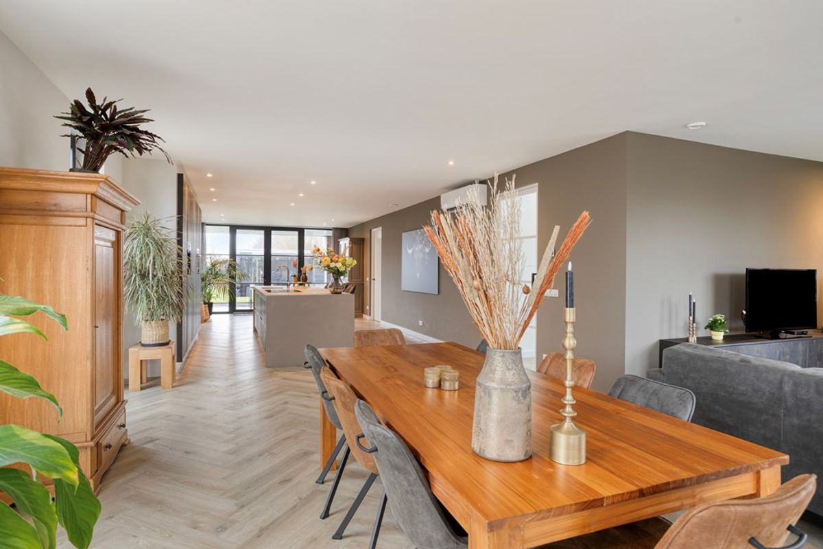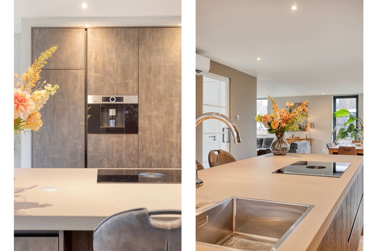 Begane grond: De statige hoofdentree ligt aan de zijkant van de woning. Hierachter is een ruime ontvangsthal (ca. 8,3m²), met bijzonder mooi uitzicht op de vide. De grote raampartijen bij de entree geven de hal een statige uitstraling. Rechts in de hal de technische ruimte (warmtepomp, Daikin 2022), garderobe en tevens de aansluiting voor het witgoed. Voor de technische ruimte de meterkast (o.a. 12 groepen / 3x aardlek). Direct links de trapopgang naar de eerste verdieping en de toiletruimte met wandcloset en fonteintje met kastje. De glazendeur met industriële uitstraling geeft toegang tot de zeer riante living met open keuken. Deze verblijfsruimte is maar liefst 89m² groot! De fantastisch en moderne keuken bestaat uit een keukenwand met geïntegreerde apparatuur zoals: grote koelkast en vriezer, geïntegreerd koffiezetapparaat, combimagnetron en veel opbergkasten. In het midden een kookeiland composiet werkblad, kastjes, lades een inductiekookplaat met geïntegreerde afzuiging (Bora), vaatwasser, spoelbak met warmwater tapkraan en bargedeelte. Het eetgedeelte is tuingericht en ligt nabij opslaande tuindeuren. Het zitgedeelte is aan de voorzijde met vrij uitzicht mede door het hoekraam. De grote raampartijen zorgen voor veel lichtinval en een aangename en warme sfeer. De woning heeft aan de tuinzijde een riante masterbedroom (ca. 13,5m²) met op maat gemaakte kastenwand. Deze kastenwand heeft een “geheime” deur die toegang geeft tot een complete badkamer (ca.8,3m²) met inloopdouche, dubbele wastafel met ombouw en een wandcloset.
