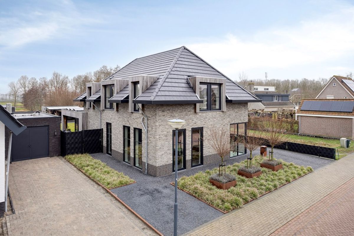 Luxe en moderne villa, type notariswoning, met royale vrijstaande garage, een ruime overkapping aan de achterzijde van de woning, een fraaie tuinkamer en schitterend aangelegde tuinen, op ruim perceel van 800m² in de nieuwe wijk ‘Waesgeerd-West’. Aan de achterzijde uitzicht op polderlandschap. Een notariswoning is een uniek type woning dat vooral in de 19e eeuw is ontstaan, maar waarvan we de bouwstijl tegenwoordig weer terug zien. Dit type woning kenmerkt zich door hun symmetrische bouwstijl, gedetailleerde gevels, dak-erkers, grote overstekken en luxueuze details. Het pand is opgetrokken uit een bijzondere grijsgekleurde baksteen, een trasraam opgetrokken uit een donkere baksteen en het schilddak is gedekt met leipannen. De gevels worden afgewisseld met een extra duurzame houtsoort (Padouk) hetgeen bijdraagt aan de fraaie uitstraling van de villa. Overal zijn aluminium (veelal hoge) kozijnen die voorzien zijn van HR++ beglazing. De villa is zeer ruim van opzet, heeft o.a. een woonkamer met open keuken van ca. 89m², een 5-tal slaapkamers en een 2-tal badkamers. Begane grond én eerste verdieping hebben een exclusieve pvc-vloer met vloerverwarming als hoofdverwarming, waarbij in meerdere ruimtes in het pand de temperatuur ook afzonderlijk geregeld kan worden. Tevens is het pand voorzien van een warmtepomp en maar liefst van 27 zonnepanelen. Zowel op de begane grond als op de eerste verdieping zit een airco. Alle muren en plafonds zijn nagenoeg alle afgewerkt met strak stucwerk. Zowel links als rechts van de woning zijn parkeerplekken op eigen terrein. De woning biedt alle comfort en privacy die je kunt verwachten bij dit type woningen. Bouwjaar 2022, energielabel A+++, perceel groot 800m², woonoppervlak ca 217,60m² en de inhoud is 866,42m³. (Pand nr. 05585)