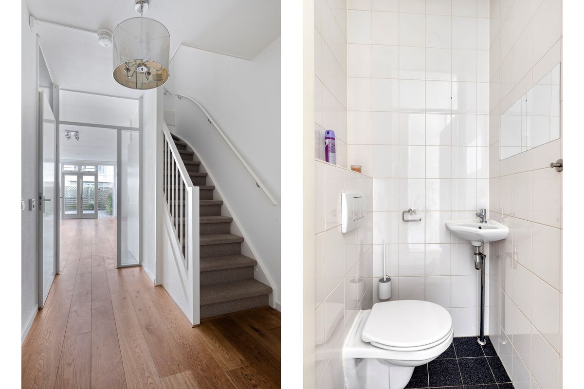 Upon entering, you step into a welcoming hallway with a conveniently located guest toilet.