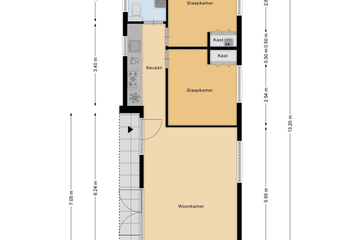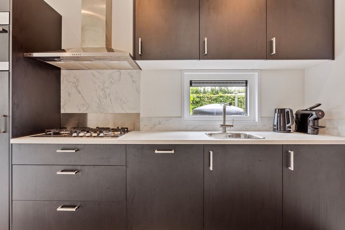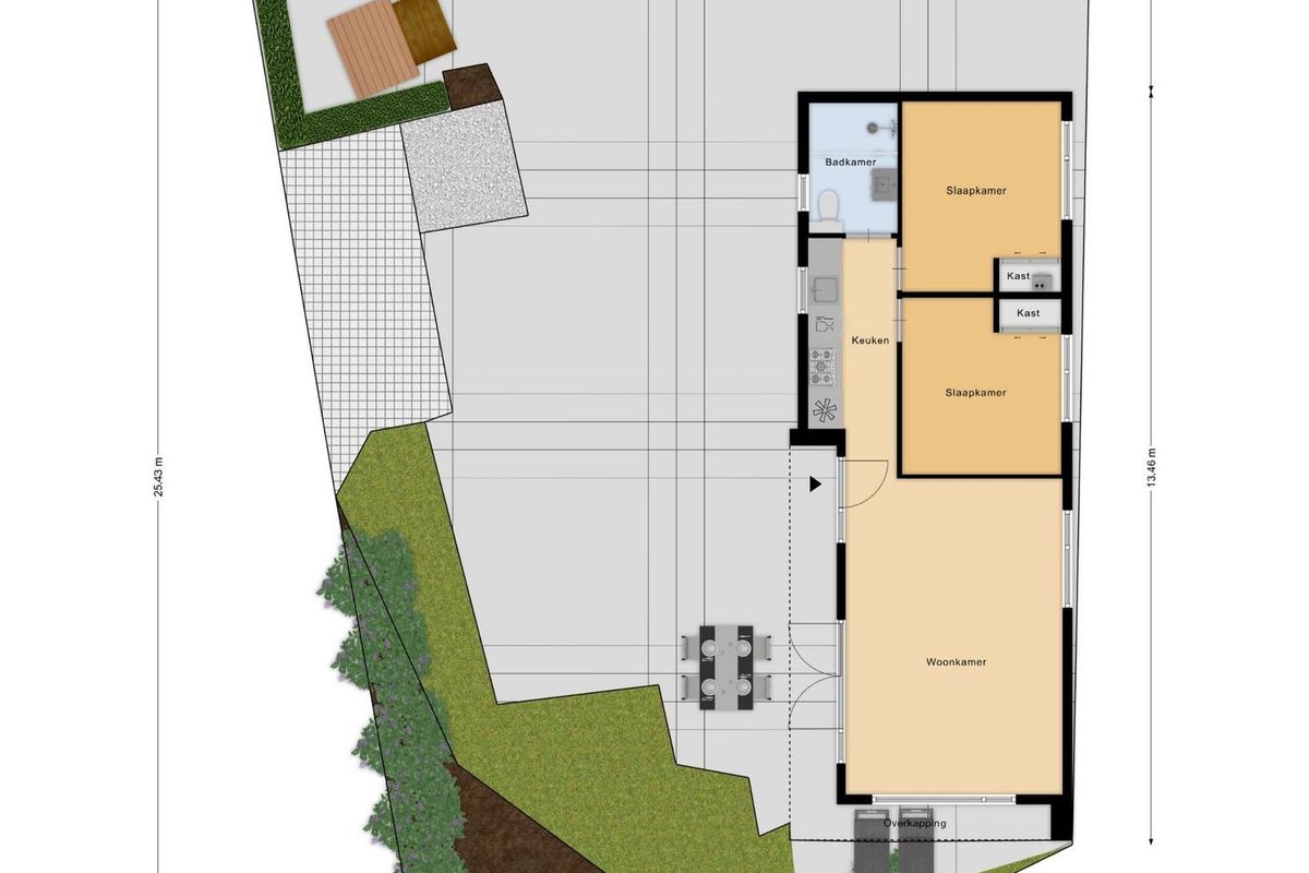 Indeling Begane grond Via de privéparkeerplaats krijgt u toegang tot het perceel, hier kunt u twee auto's naast elkaar kwijt. De entree geschiedt via de voordeur en geeft toegang tot de ruime woonkamer. De woning heeft een ruimtelijke indeling en grote raampartijen die veel natuurlijk lichtinval verzorgen. Daarnaast wordt het aangeboden inclusief inboedel en is daarmee dus direct klaar voor gebruik, ideaal voor zowel eigen gebruik als verhuur. Met openslaande deuren haalt u het buitenleven naar binnen en combineert u de tuin met het woongedeelte. De woning is voorzien van een lichtkleurige vloer in houtmotief en deze geeft comfort en sfeer in combinatie met de inbouwspots en het strakke afwerkingsniveau. De open keuken is in een neutrale maar moderne kleurstelling uitgevoerd en beschikt over een vaatwasser, oven, koelkast, gaskookplaat en afzuigkap. Een blad in marmerlook en uitzicht over de voortuin geven net even wat extra's mee. Beiden slaapkamers zijn met circa 7 m2 en 8 m2 van een goed formaat en voorzien van een vaste kast. Daarnaast beschikken deze ruimtes over raampartijen welke een balans van privacy en lichtinval geven. Tevens is hier genoeg ruimte voor 2 persoonsbedden en nachtkastjes waardoor de woning geschikt is voor een verblijf met vier personen. De badkamer is nabij de slaapkamers gelegen en voorzien van een toilet, breed wastafelmeubel en een zeer royale douche met glazen schuifdeur, afgewerkt met luxe details. Met brede wandtegels en antracietgrijze vloer heeft de badkamer een tijdloze stijl en is tevens onderhoudsvriendelijk.