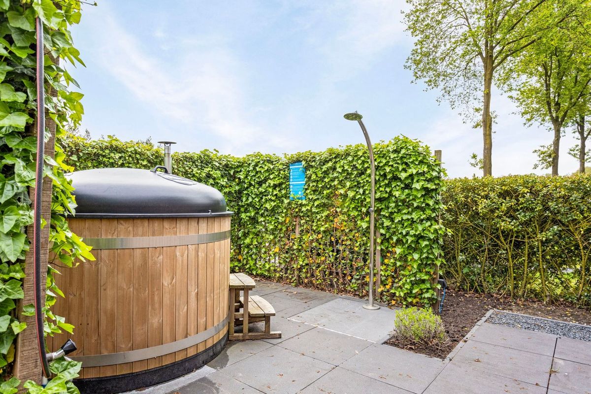 De tuin, zorgvuldig aangelegd met oog voor architectuur, beschikt over een afgeschermde wellnesshoek. De welnesshoek is afgeschermd doormiddel van natuurlijke afscheidingen waardoor u hier met privacy gebruik van kan maken. U kunt ontspannen in de jacuzzi of uzelf verfrissen onder de buitendouche op warme dagen. Het aangelegde tegelterras biedt een mogelijkheid om te dineren of te genieten van de rust met een bak koffie. De verschillende terrassen bieden mogelijkheden tot meerdere zitplekken, de inbouwspots in de overstek en de buitenwandverlichting bieden extra details en sfeer in de avond.