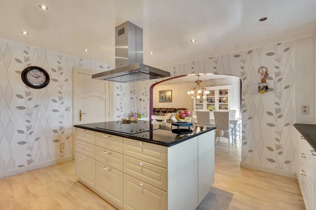 Open inbouwkeuken (19 m²) met porseleinen gootsteen, granieten werktablet, inductiekookplaat met afzuigkap, stoomoven, micro-oven, vaatwasser, frigo en vriezer