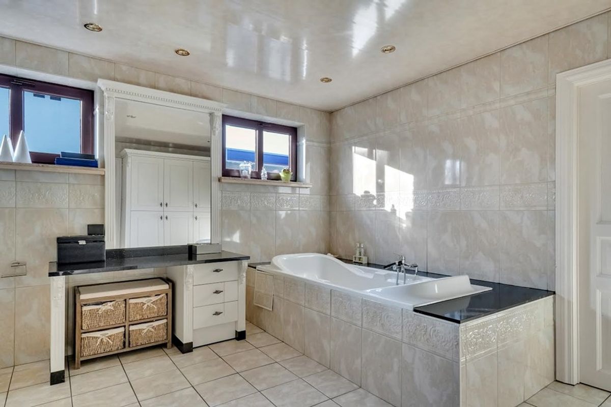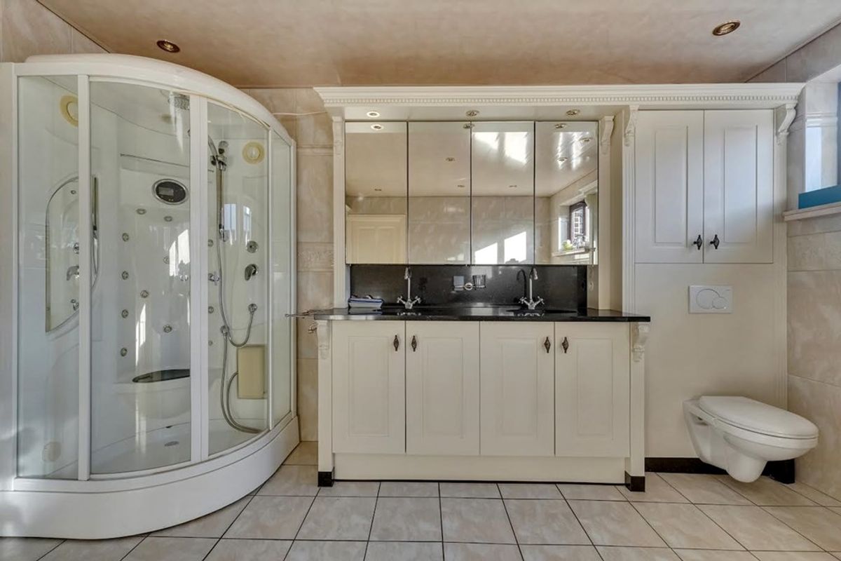 Badkamer (18 m²) met ligbad, ruime douche, dubbele lavabo verzonken in granieten tablet en spiegel