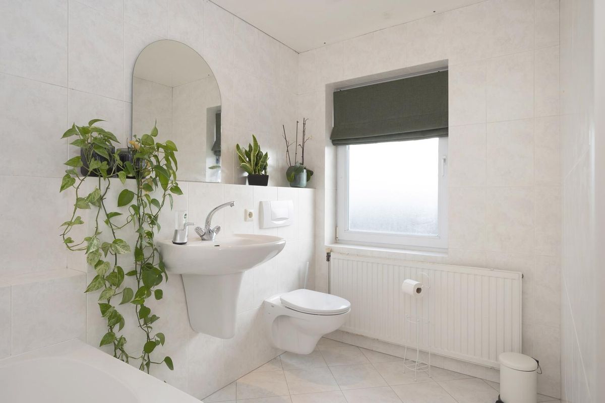 De geheel betegelde badkamer is voorzien van een ligbad, toilet en wastafel. In de berging bevindt zich de opstelling van de cv-ketel (Nefit HR-combi, 2019, huurtoestel).