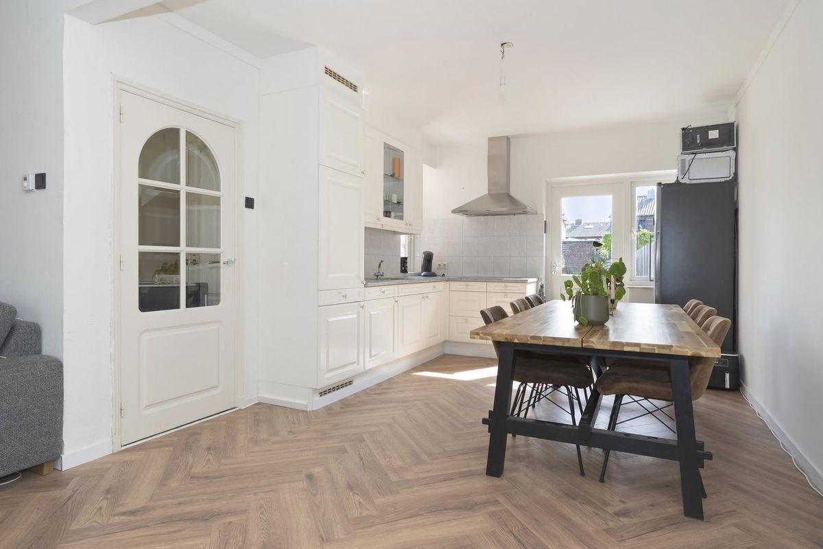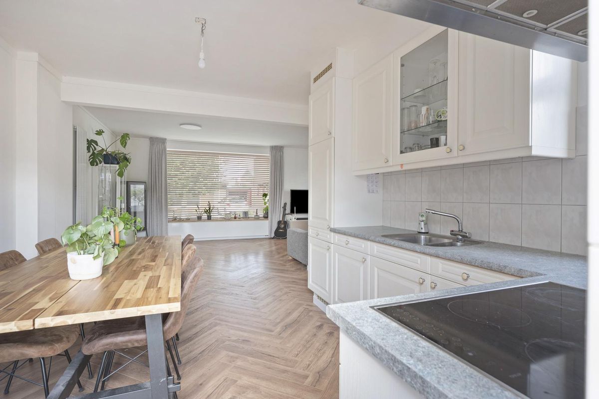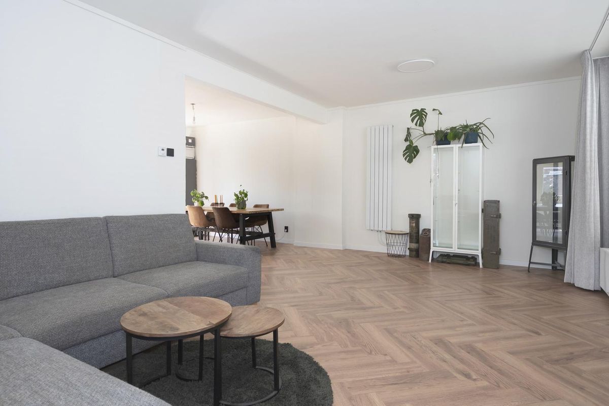 Ruime L-vormige leefruimte (circa 40 m²), bestaande uit een lichte woonkamer en een open keuken met tuindeur. De keuken is voorzien van een keramische kookplaat, afzuigkap en koelkast. Woonkamer en keuken zijn afgewerkt met een moderne visgraat laminaatvloer.