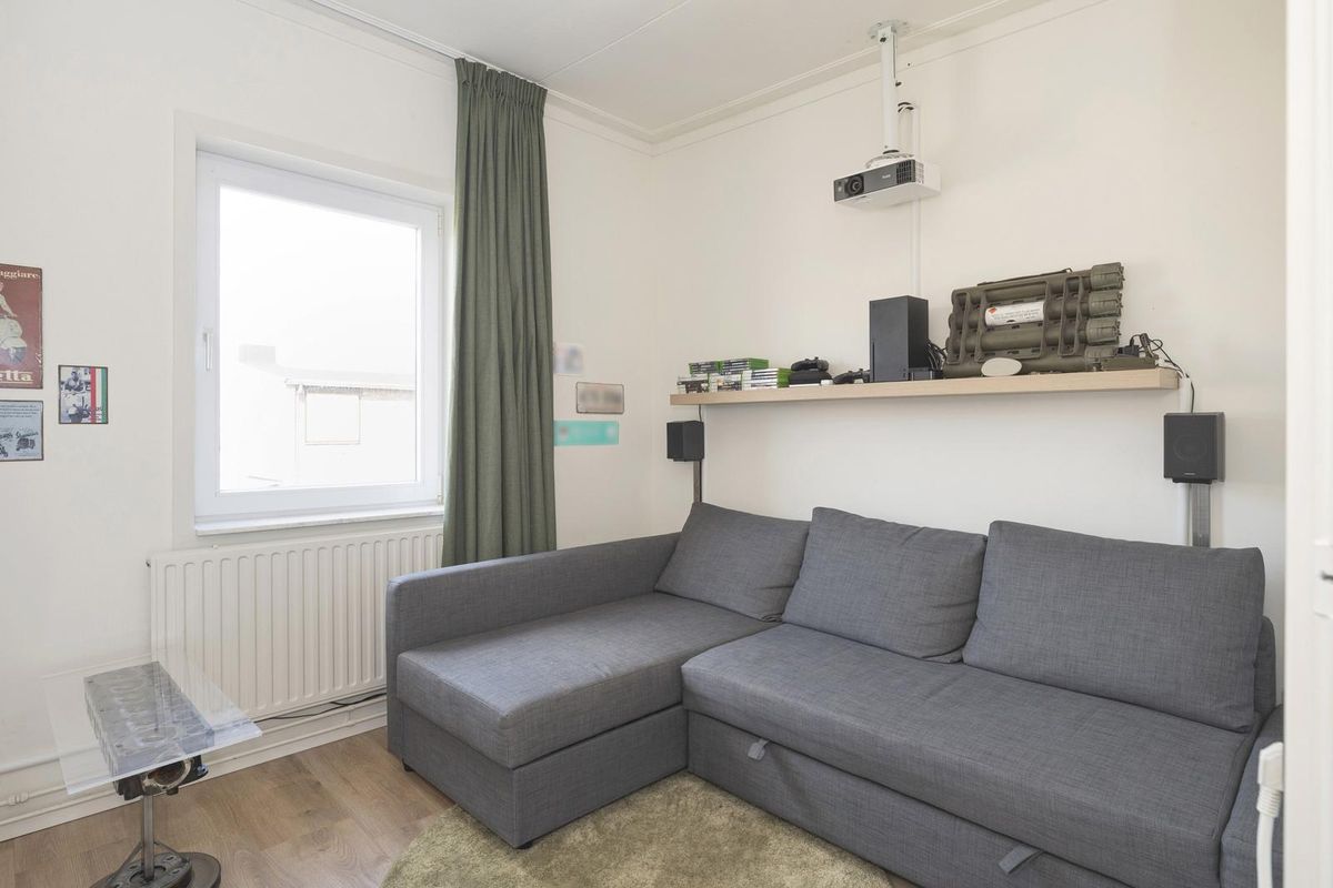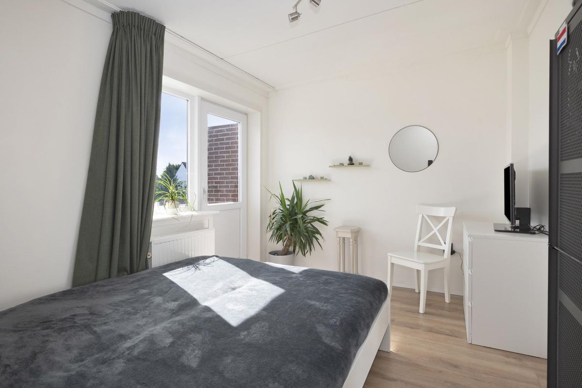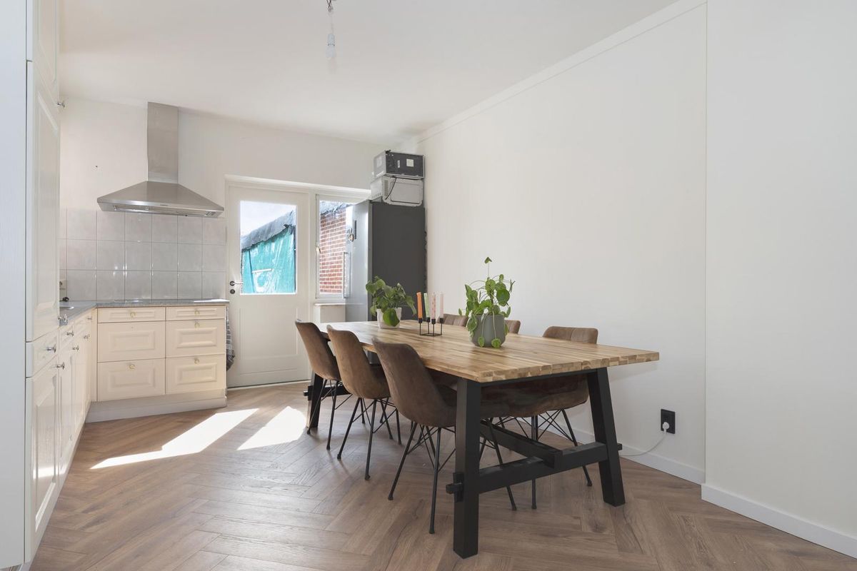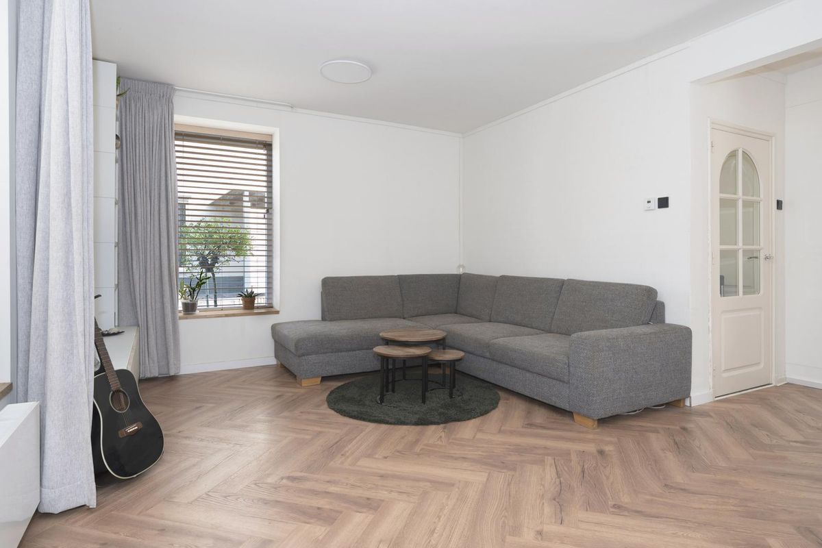 Ruime L-vormige leefruimte (circa 40 m²), bestaande uit een lichte woonkamer en een open keuken met tuindeur. De keuken is voorzien van een keramische kookplaat, afzuigkap en koelkast. Woonkamer en keuken zijn afgewerkt met een moderne visgraat laminaatvloer.