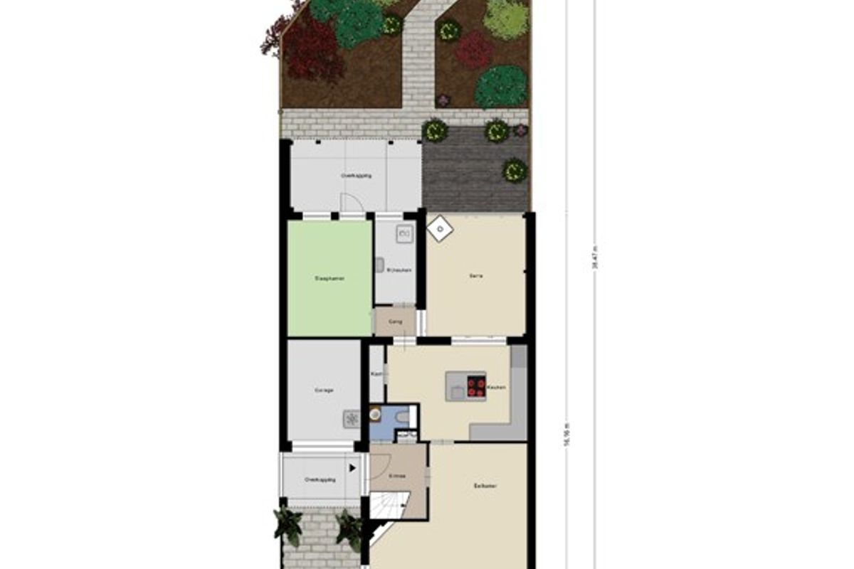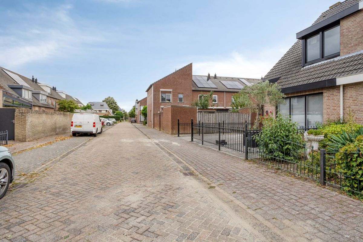 De achtertuin is volwassen aangelegd met groenborders en bestrating. Vanuit de serre en overkapping heeft u zichtlijnen tot achter op het perceel – een prachtig uitzicht over uw eigen stukje buitenruimte.
