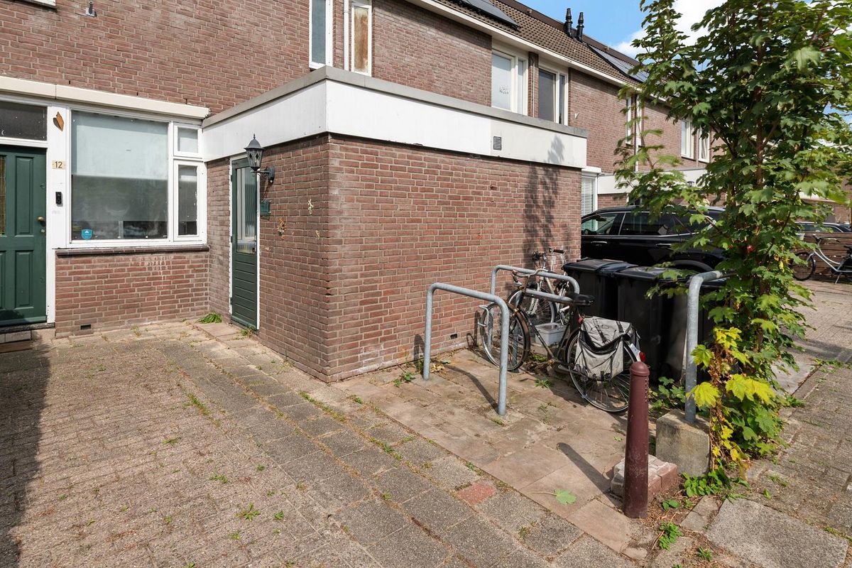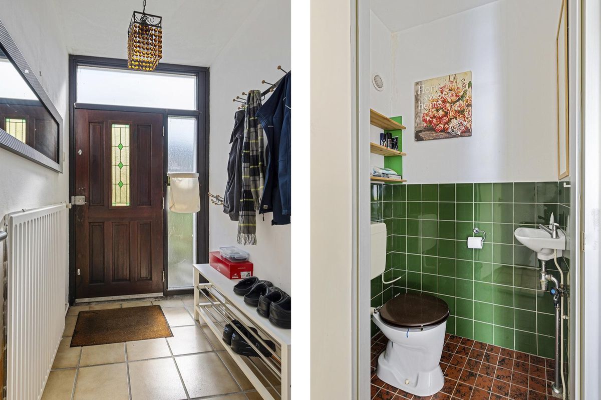 The driveway leads to the entrance with meter cupboard. The hall provides access to the bright living room. The living room is connected to the kitchen at the front of the house. The kitchen also provides access to the attached storage room. The back garden is accessible from the living room and has a back entrance. The hall in the living room provides access to the toilet and the stairs to the first floor.